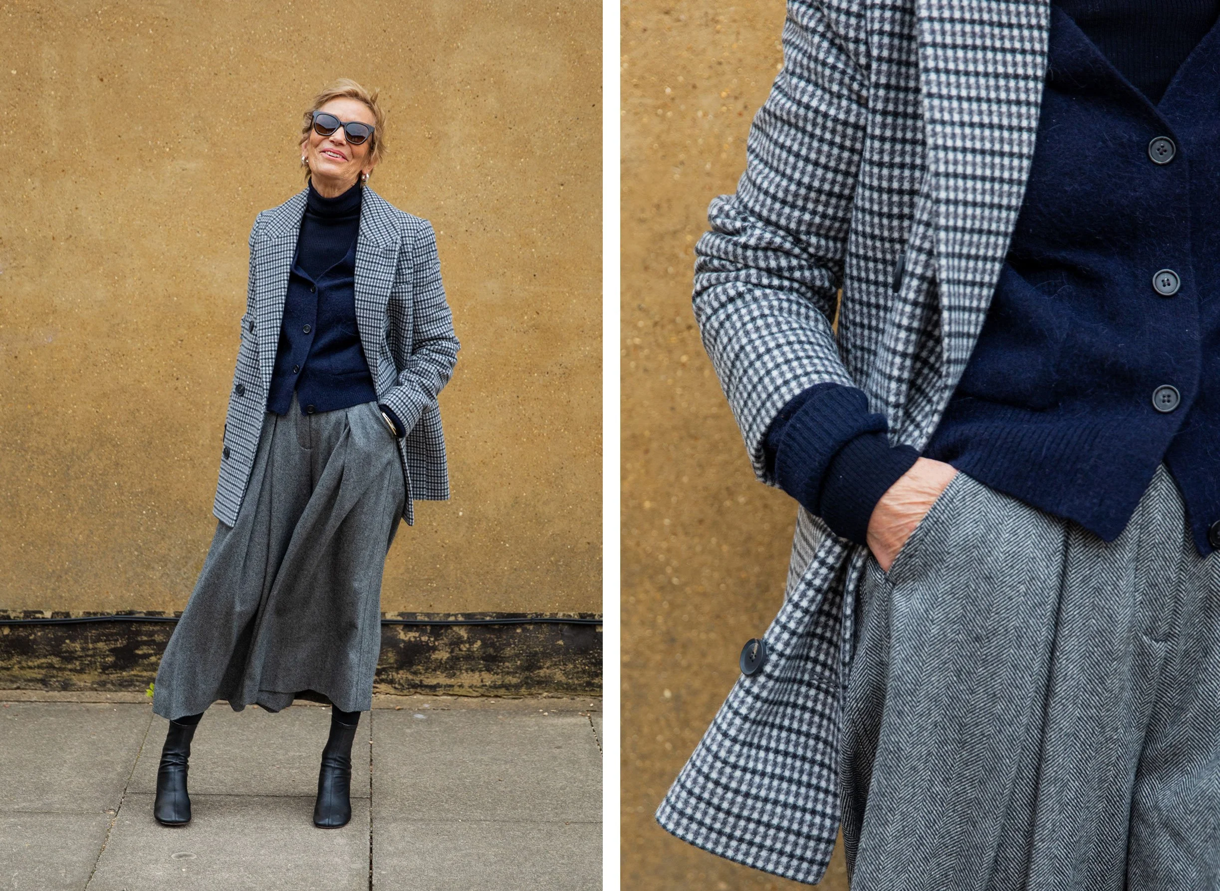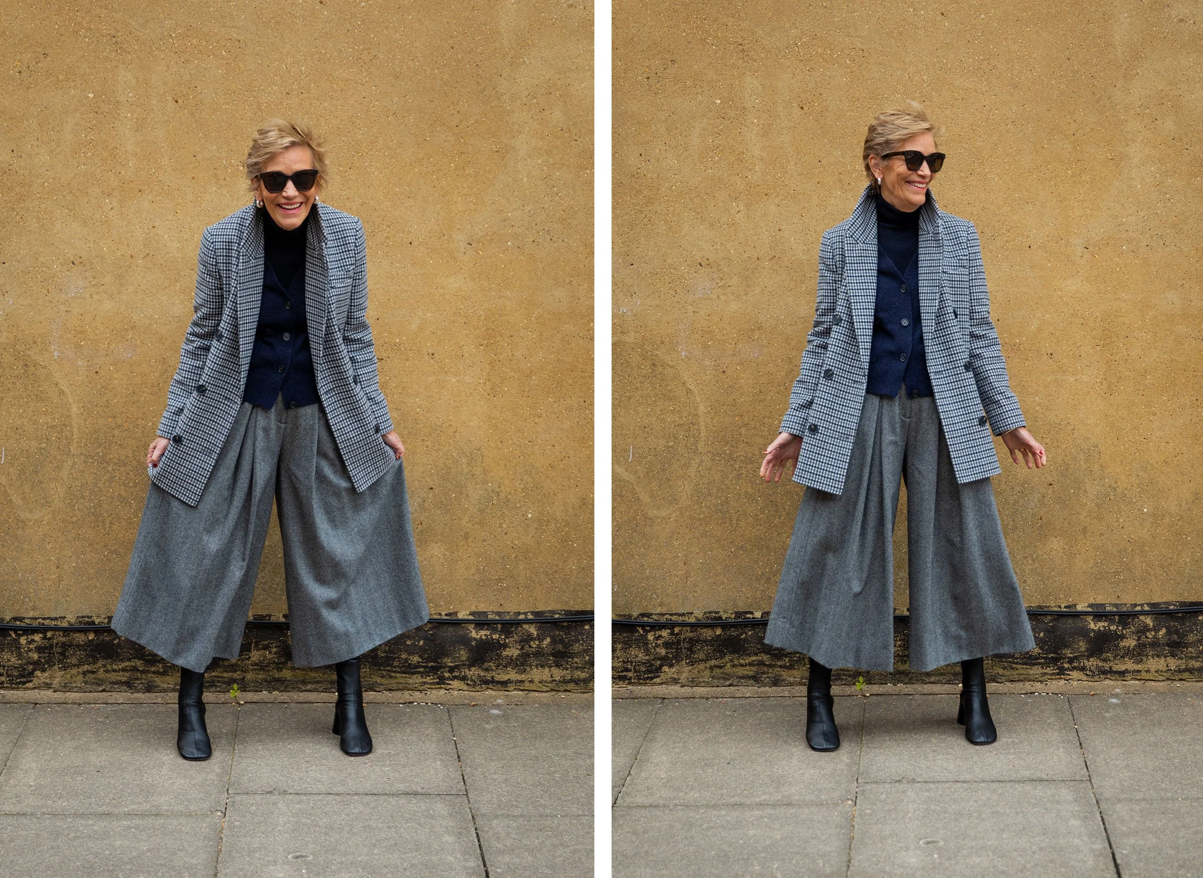 A brand whose fortunes are most definitely riding high is Me & Em. I know that many of you are fans, as am I. I remember receiving one of their early catalogues and thinking oooh, now this looks interesting. I would say that the brand produce classic clothing with a point of difference. They say that their collections are timeless and are built to last. The wool, herringbone culottes that mum is wearing are a perfect example of this. A beautifully tailored culotte is an item that should stand the test of time. They are versatile too. Perfect worn during the day with flat loafers or in the evening with a heel (mum has modelled both!). For those of you that work in an office, this could be a great outfit.