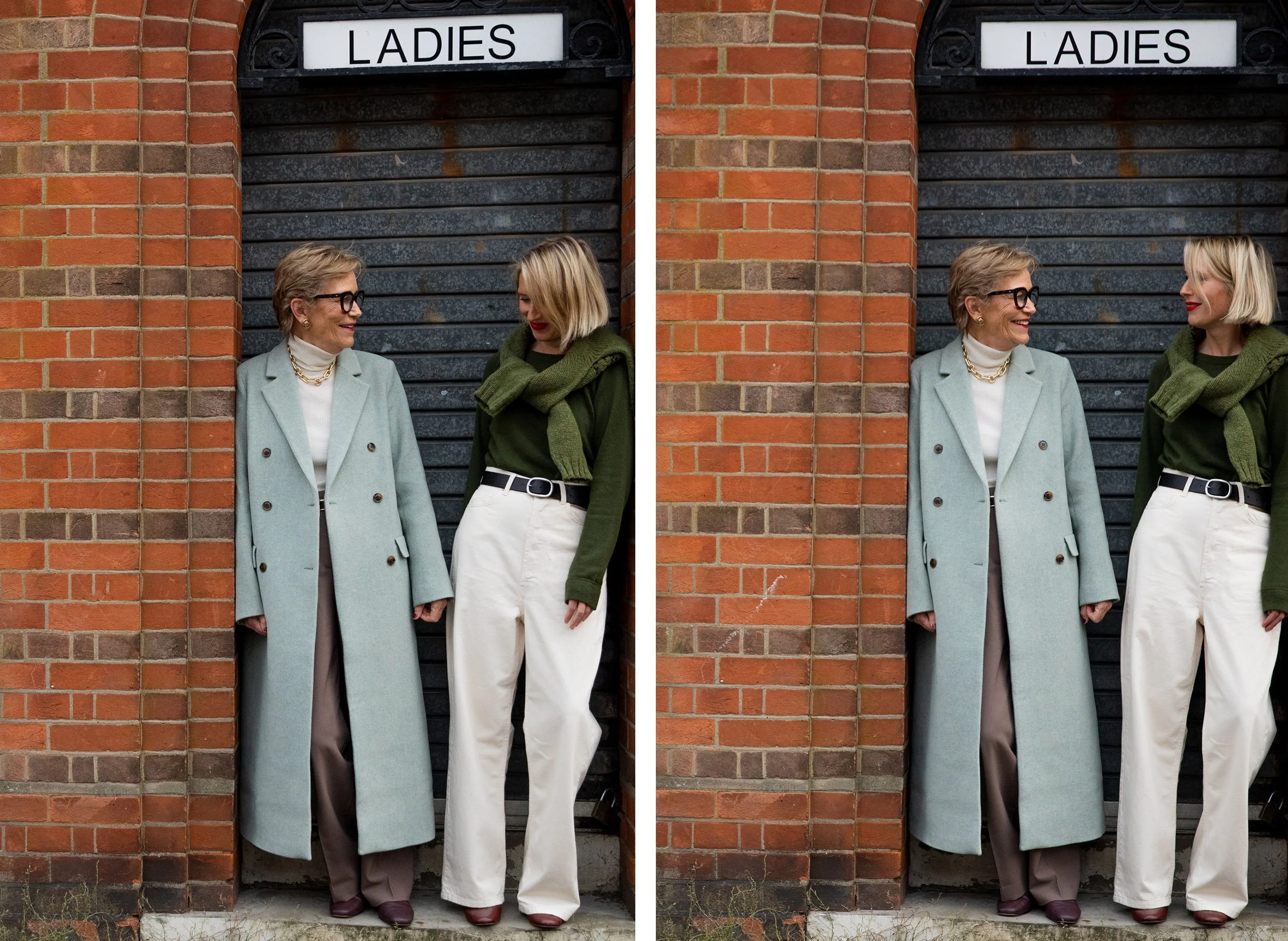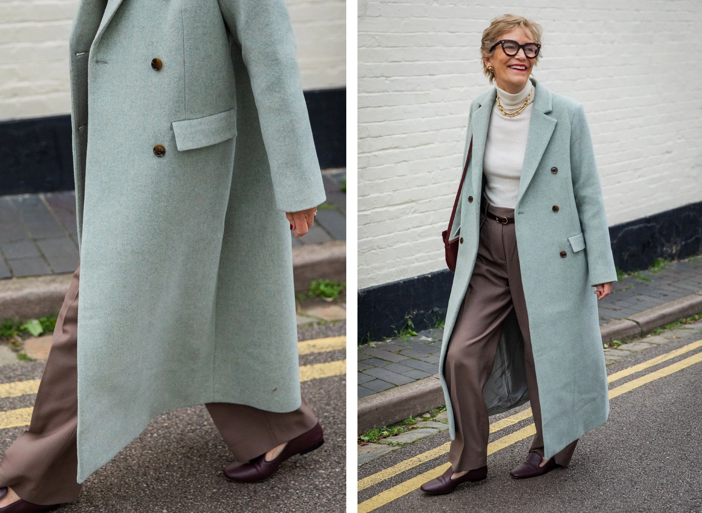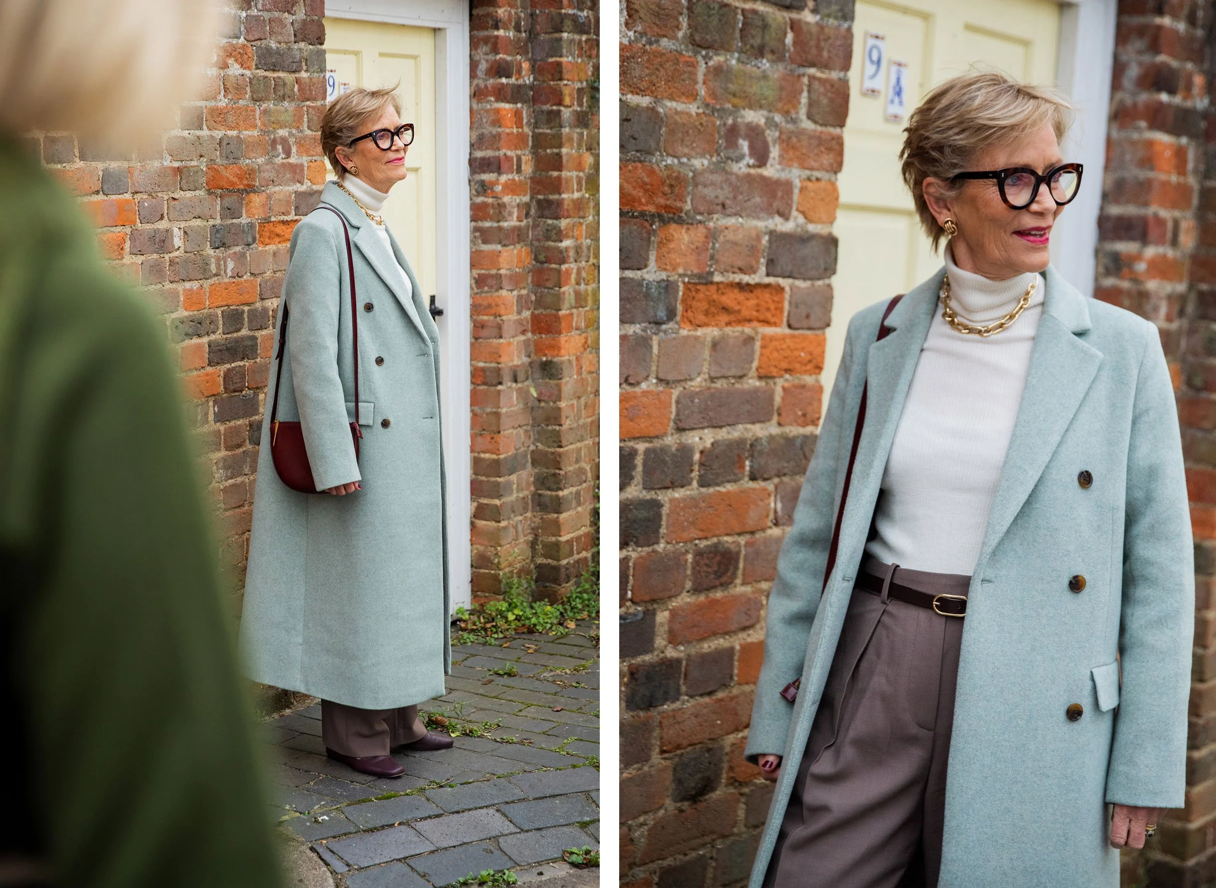Mum’s sage/pistachio coloured coat is wonderful. Much like a room painted in sage, the colour is such a fantastic backdrop to highlight other hues. I love the combination with the soft brown trousers. It’s unusual but it works.
