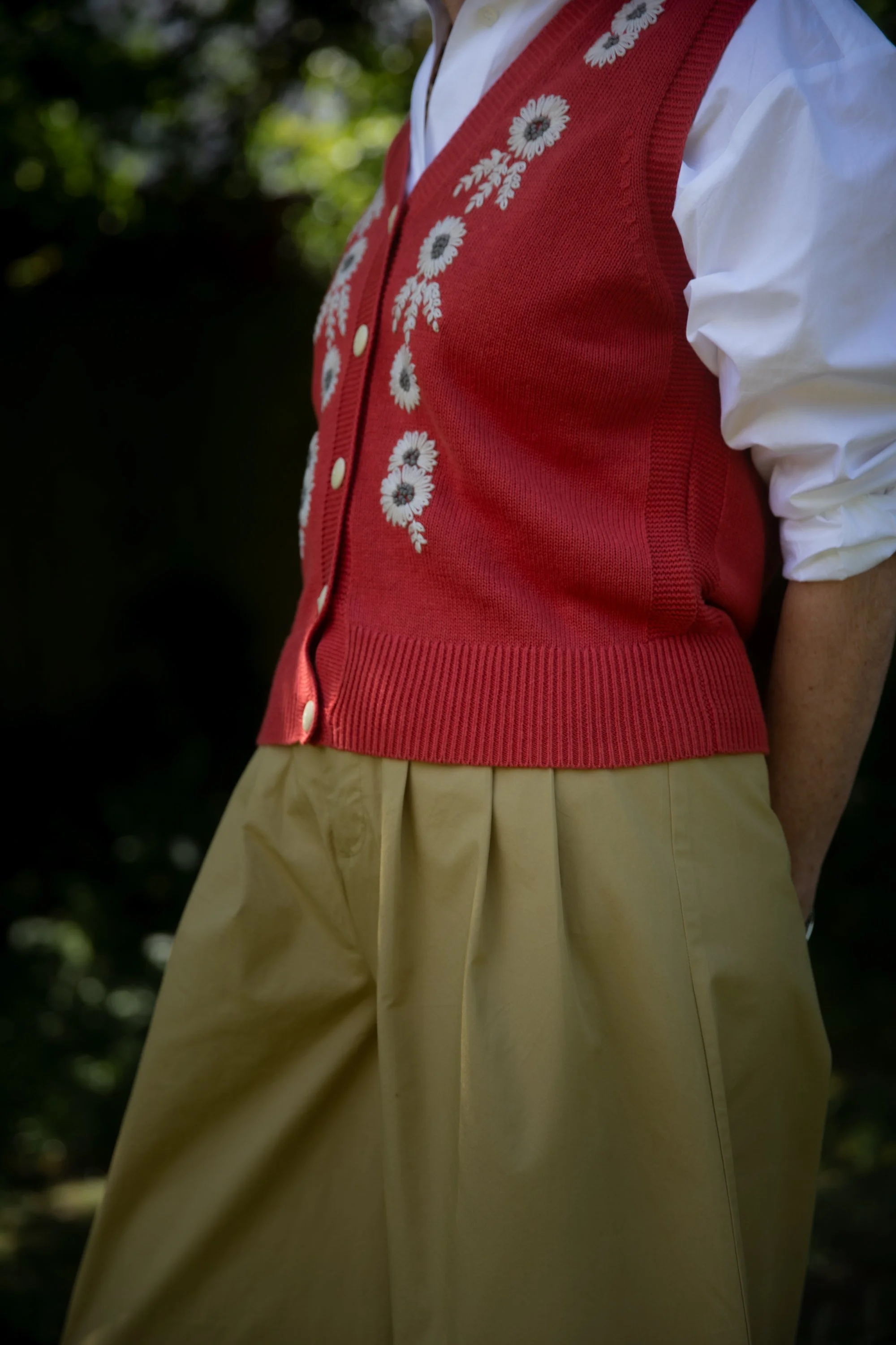 This knitted waistcoat encapsulates perfectly great design and practicality. Worn on its own or with a shirt, in the summer or in the winter, it is a piece of clothing that I would consider to be a great investment. It would add a vibrant and interesting layer to an outfit in winter, popping out under a wool coat and worn over thick high waisted trousers. It would also be perfect for the evening worn with a silk shirt and palazzo pants.