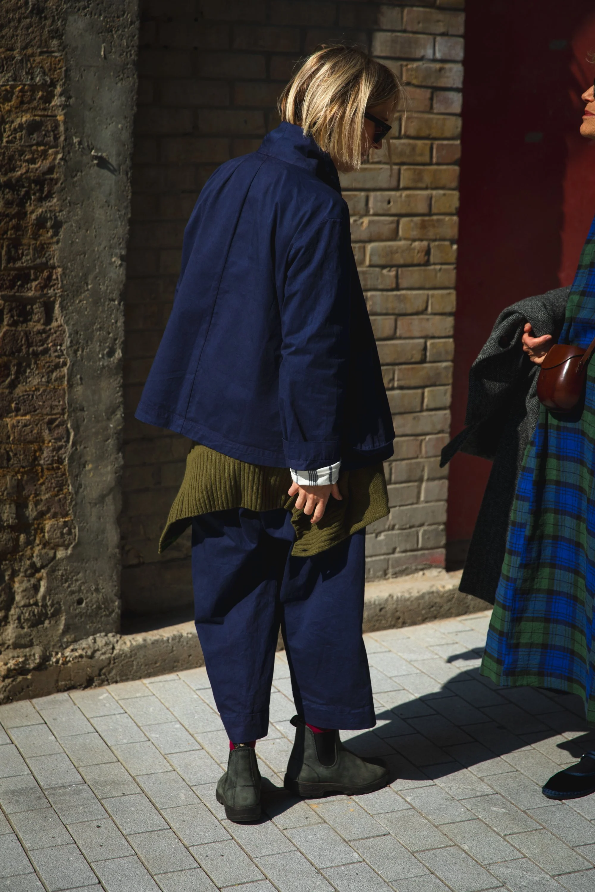 The hue of the jacket and trousers is perfect for off-setting so many other colours from neutral tones through to yellows, greens and reds. The suit can obviously be worn separately - both items being equally useful in a hard working capsule wardrobe. The jacket is their take on a ‘workwear jacket’ but the accentuated patch pockets and shawl collar give it that extra interest and elegance that many other versions do not have.