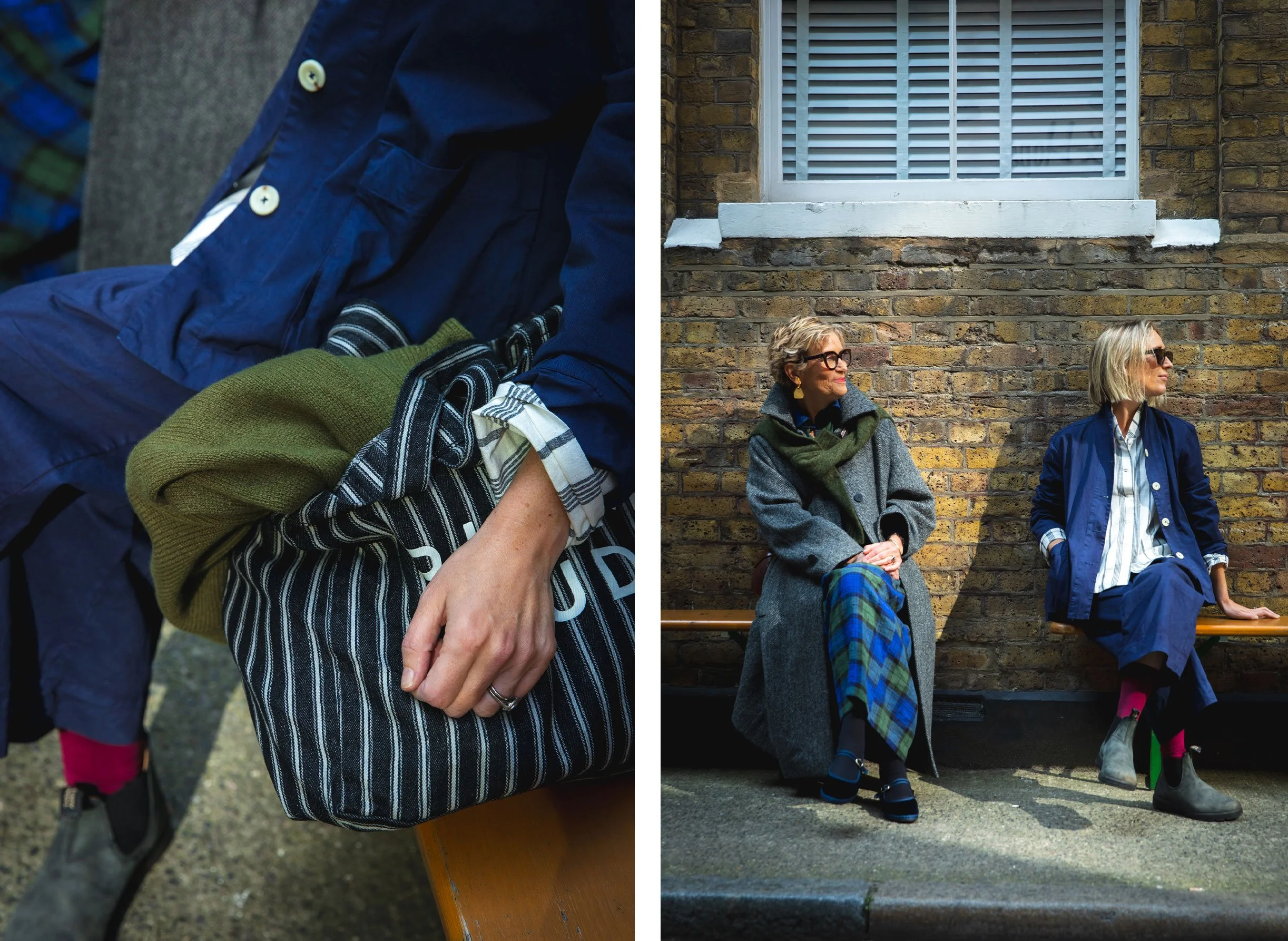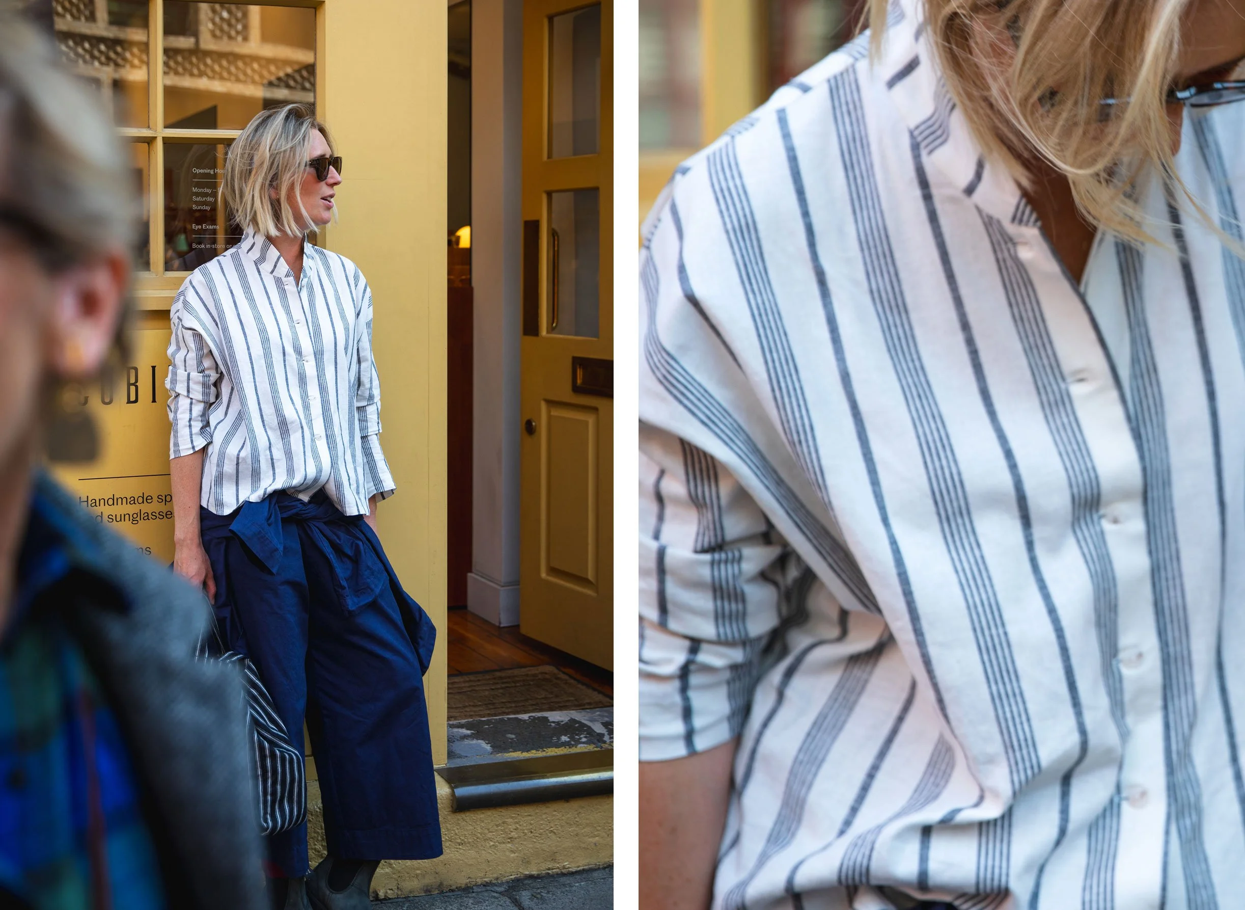 In hindsight I wish that I had shown you the shirt and jacket combo worn with the green cardigan (poking out of my bag). It would look great over the shirt and under the jacket with one or two buttons done up so that you get the flash of green against the crisp white and grey stripes. Chef’s kiss!
