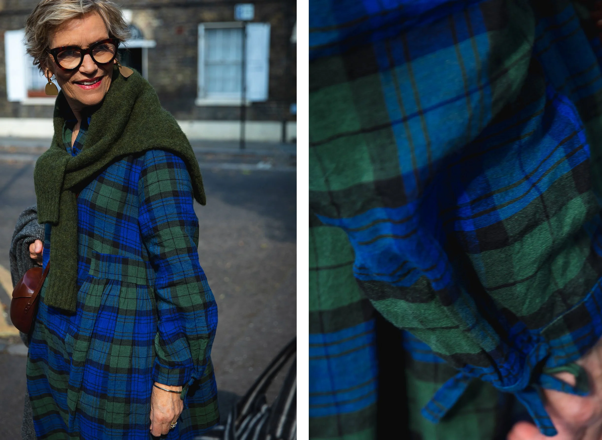 But back to blue. Mum’s dress is made from such a gorgeous, vibrant tartan. The combination of the (almost) electric blue with the moss green is perfection. Mum and I will always be drawn to an a-line shaped dress, particularly around the festive season when comfort is key….you want to be able to stretch for that extra roast potato without worrying that your waistband is going to pop!
