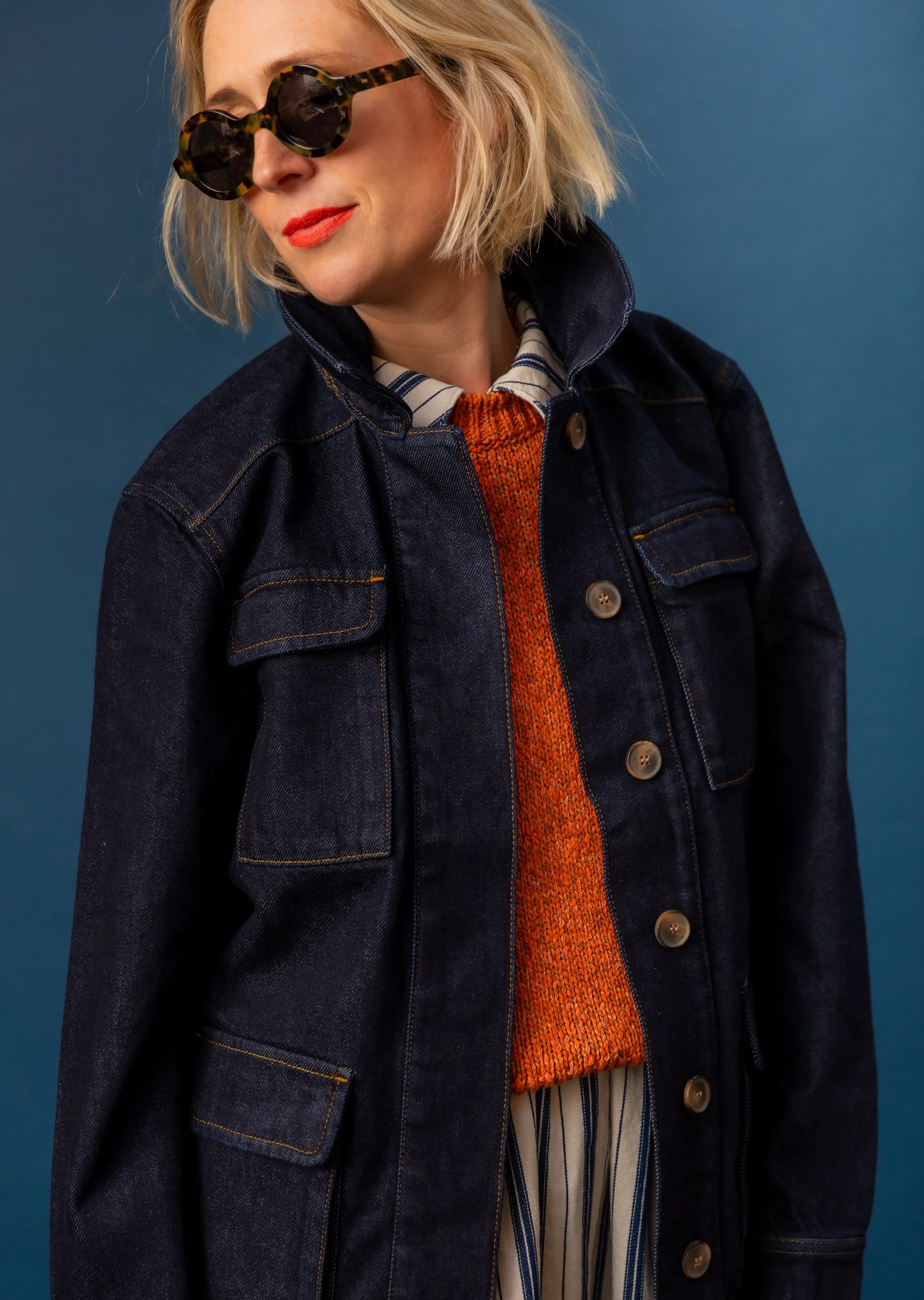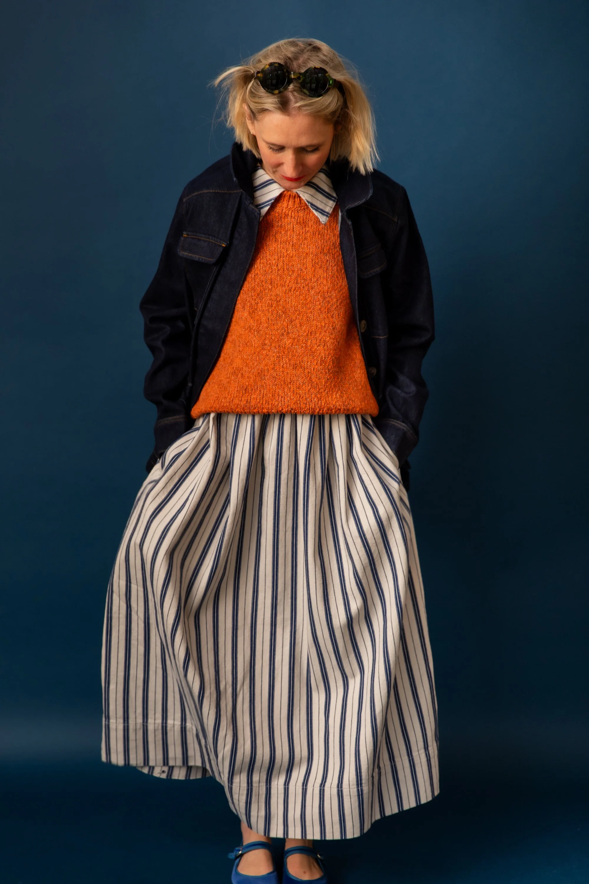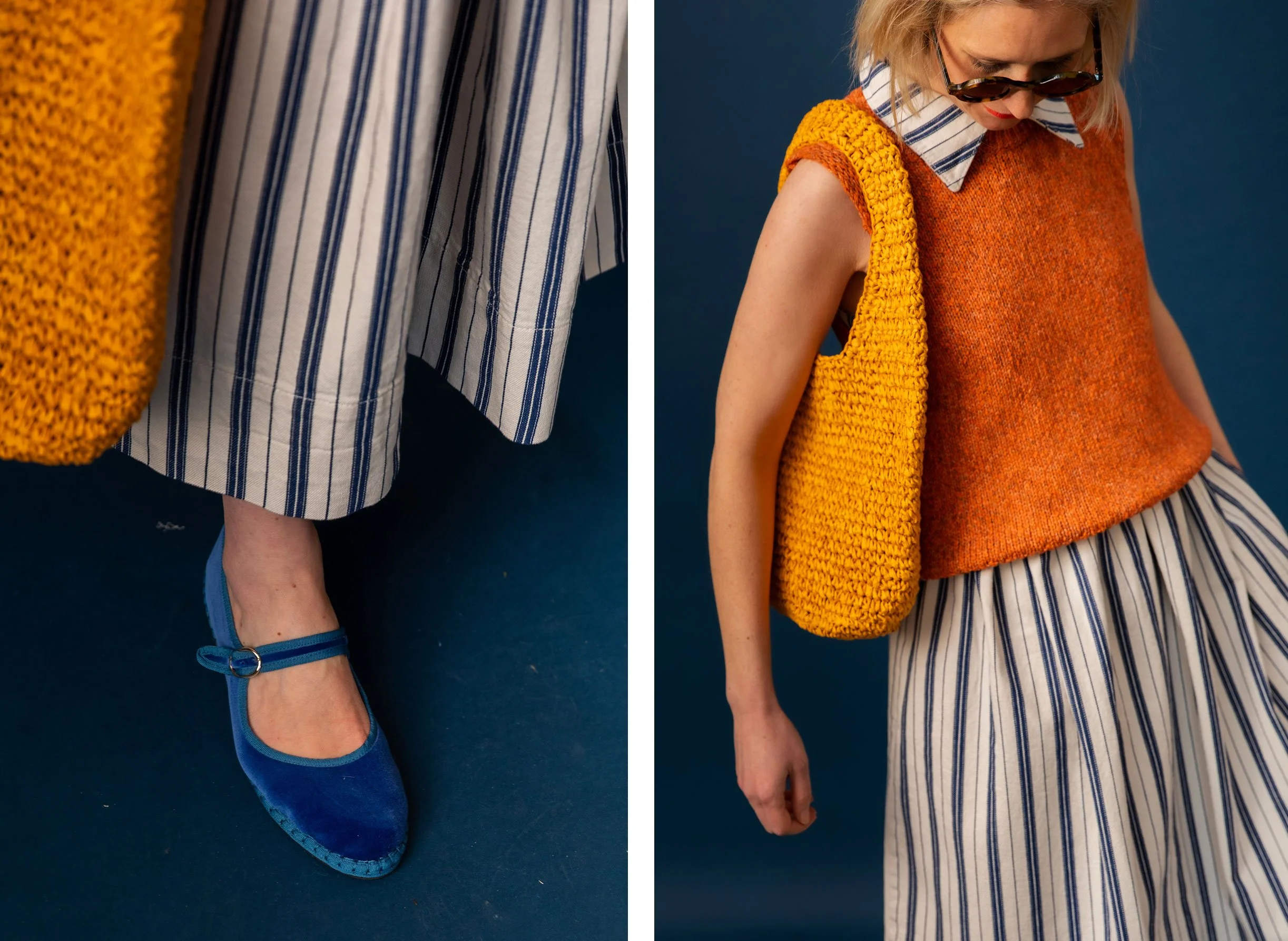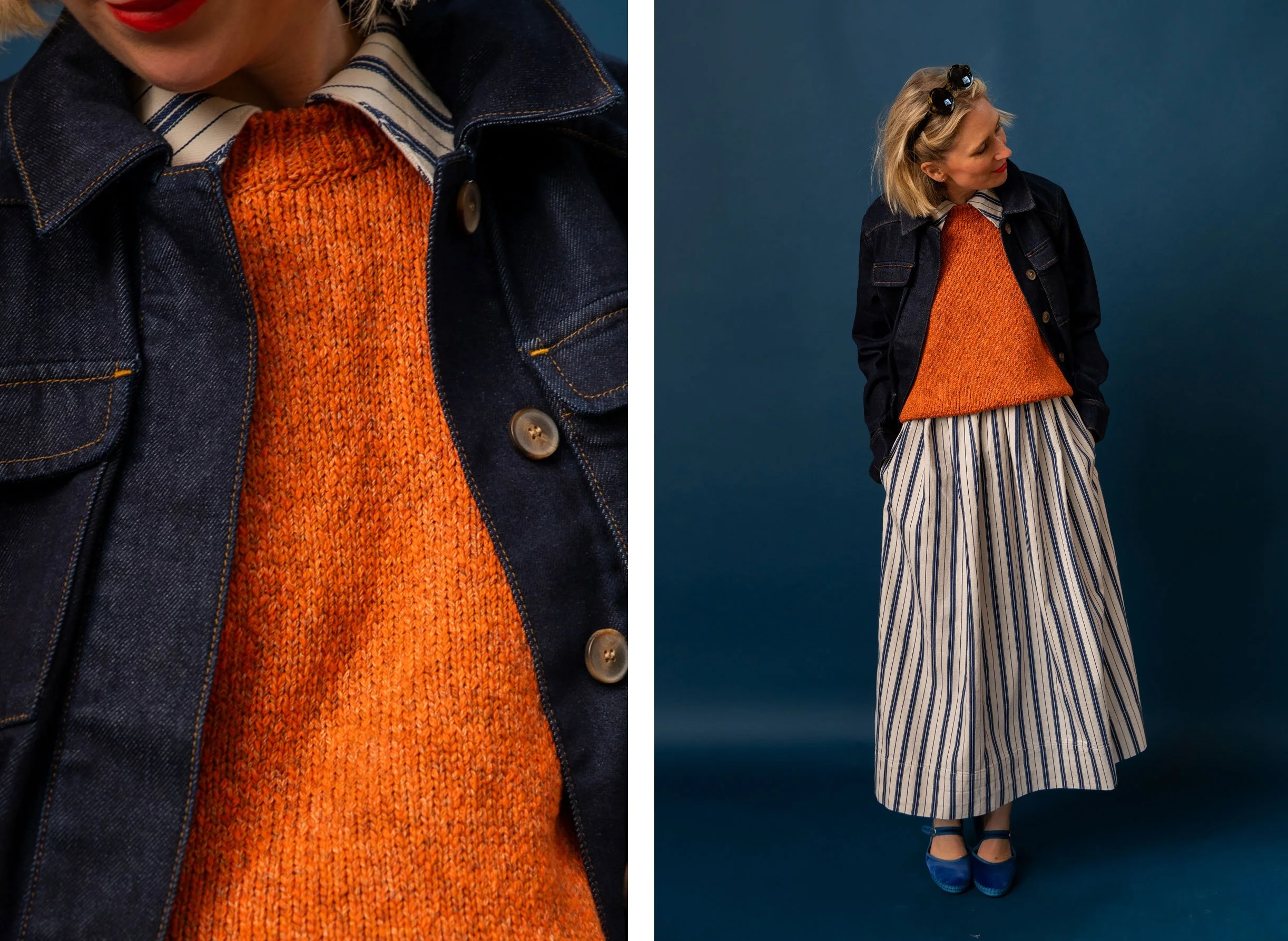 The tangerine colour of my tank top is delicious but for a more subtle look, a navy blue or pale blue knit would work just as well. Also, notice how the dark denim jacket subdues the overall look into something more paired back. It’s worth remembering that jackets often do this. A dark denim or navy blue can be useful in this regard, as can a cream one like this or this.