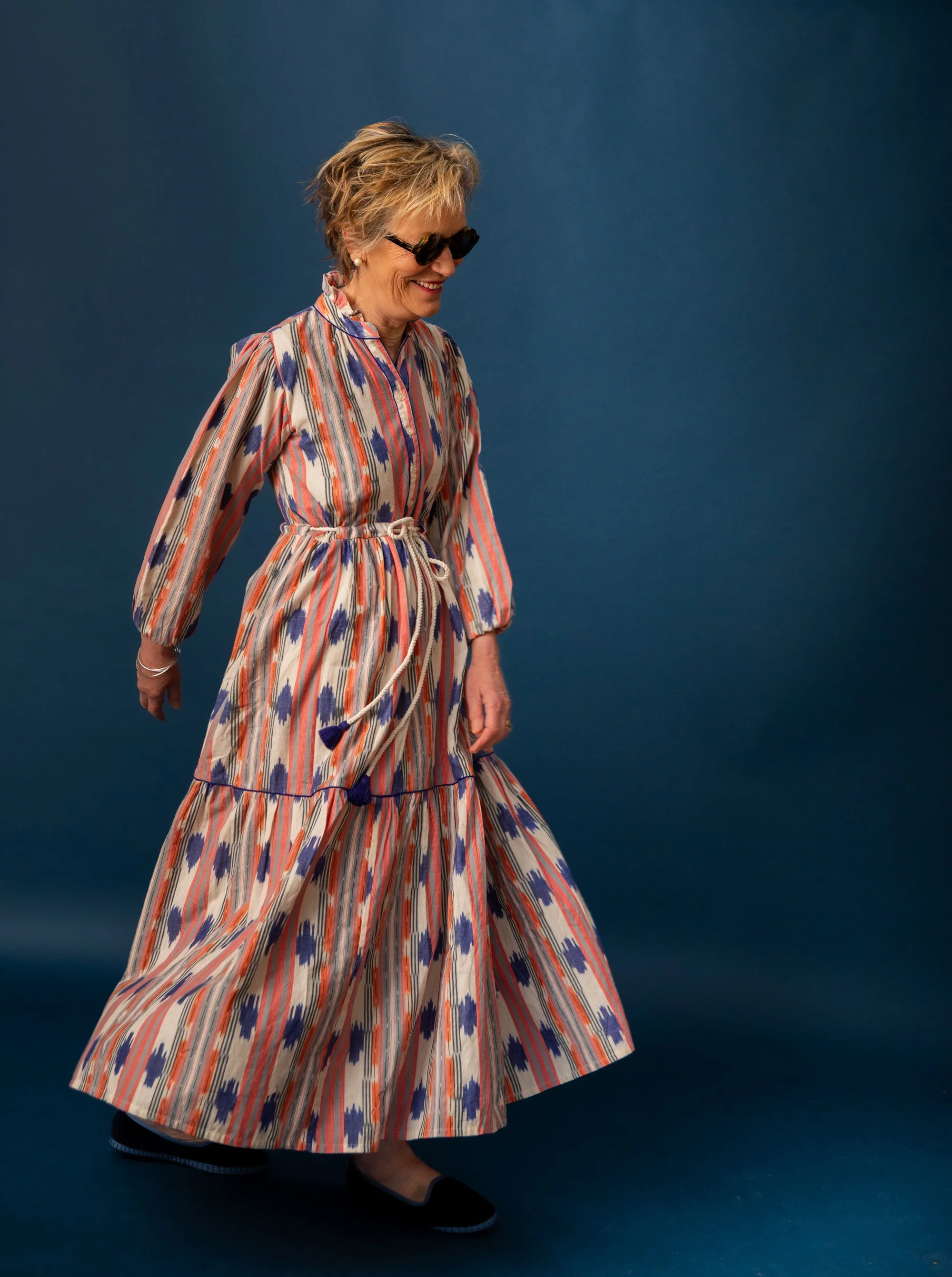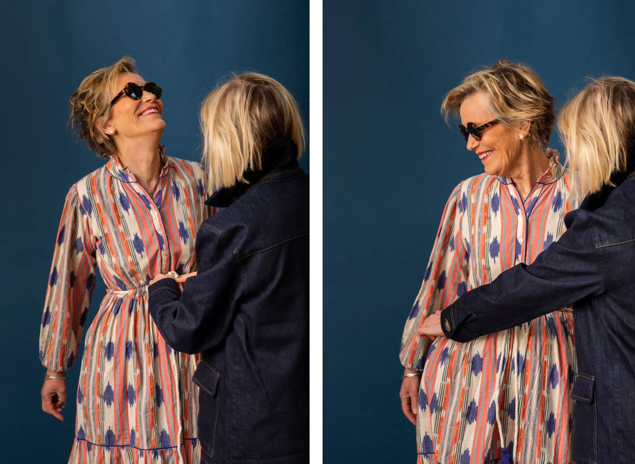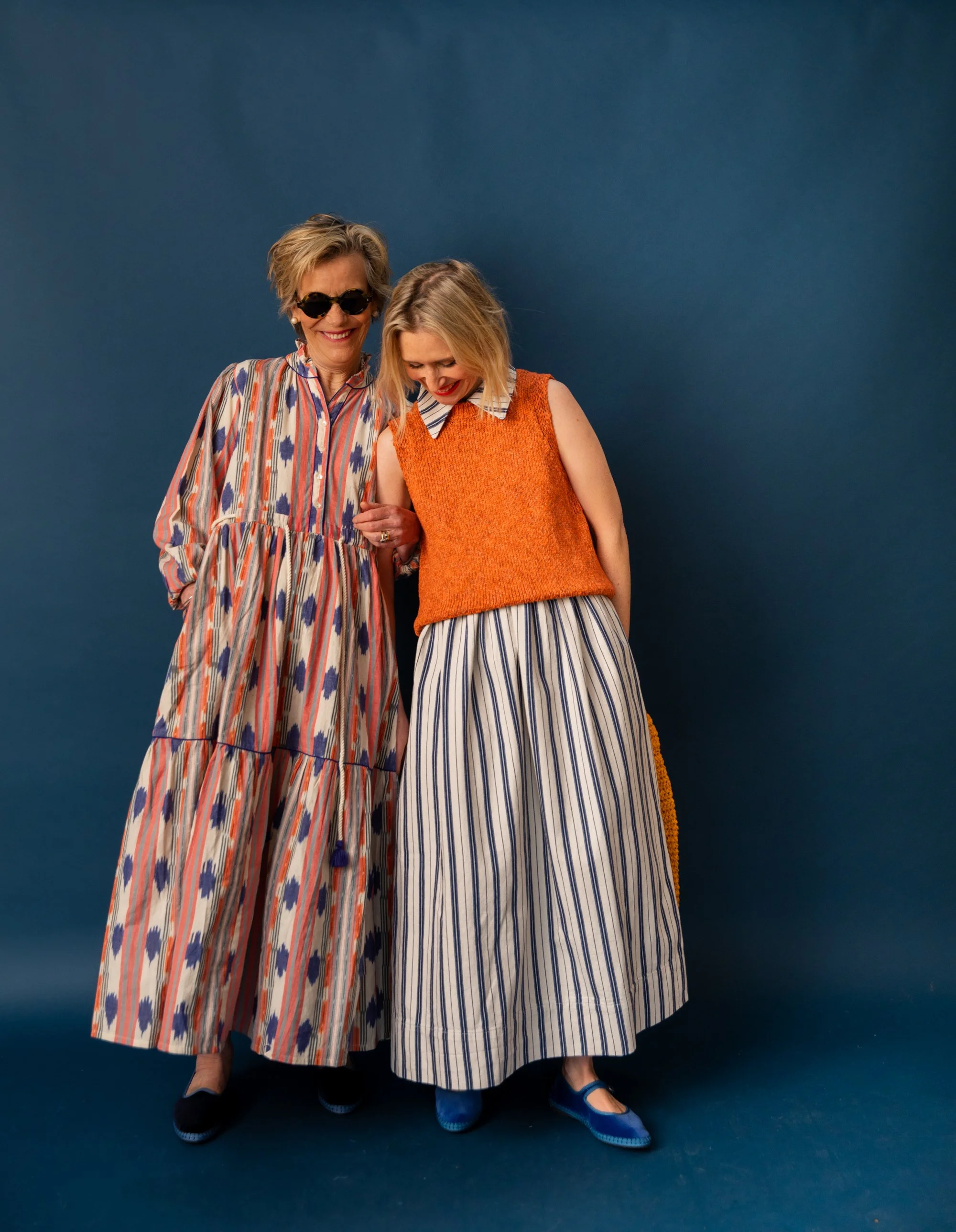 The fabric of mum’s dress is a particularly lovely print and colour combination. It is quite a bold ikat pattern but coupled with the simple style, it feels pretty restrained in its overall look. If you’re not someone who usually gravitates towards print but is keen to try, maybe choose a classic silhouette to start with. That way you’re not pulling yourself out of your comfort zone in all directions.