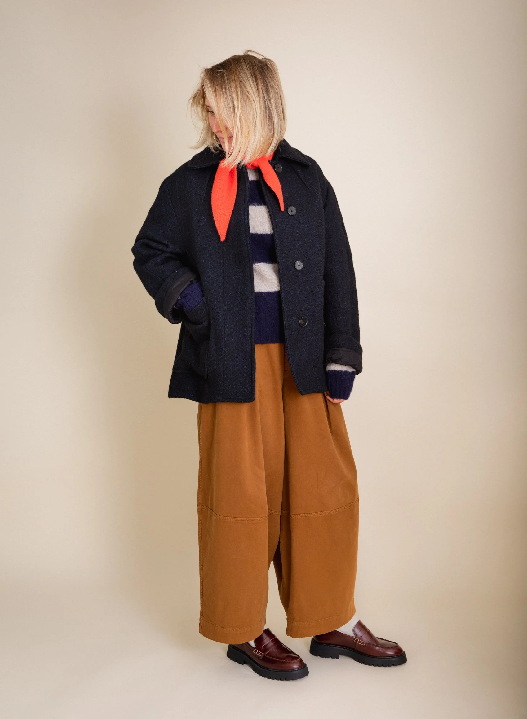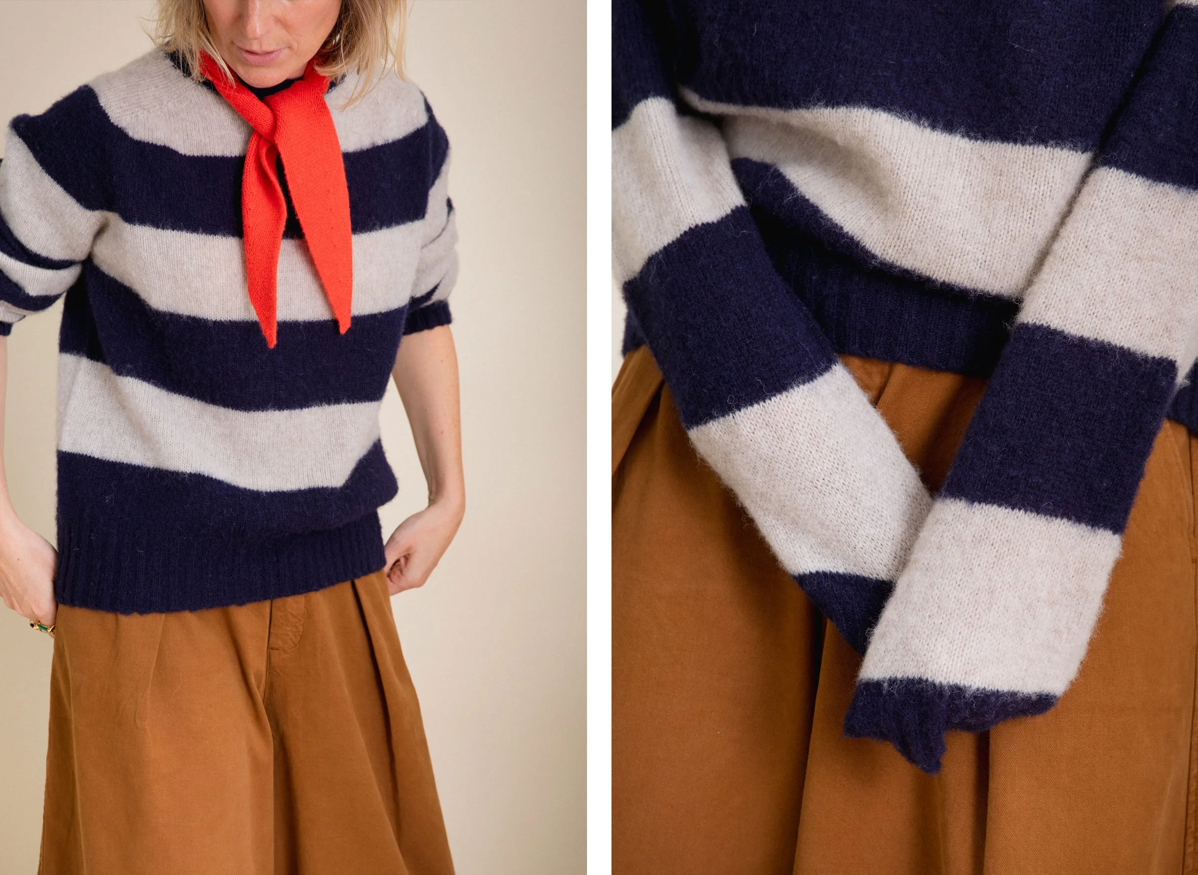 Think about the use of colour when you’re putting an outfit together. The outfits here are not made by the individual pieces but by the juxtaposition of colour and pattern. For example, I love the combination of the turmeric trousers with the pop of red around my neck. The bold stripe of my jumper is anchored by the dark navy of the coat, preventing the overall outfit from looking too ‘whacky’. Of course, if you wanted to dial it down, choosing a more neutral neck tie would do the trick. Playing around with colour and pattern is an effective way of creating an interesting look without buying new clothes or necessarily breaking the bank.