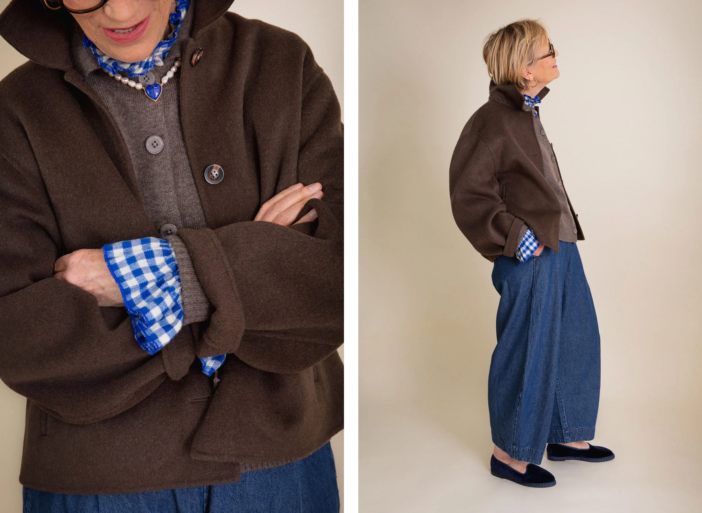 Another simple way of elevating an outfit is to wear a bold blouse under an otherwise tonal look. This blouse by Kate Barton is super striking with its frilled gingham collar and cuffs. They’re also fun and playful. If you’re someone who ordinarily does not wear a lot of pattern then this is a nice trick to inject some pattern without it being overwhelming.