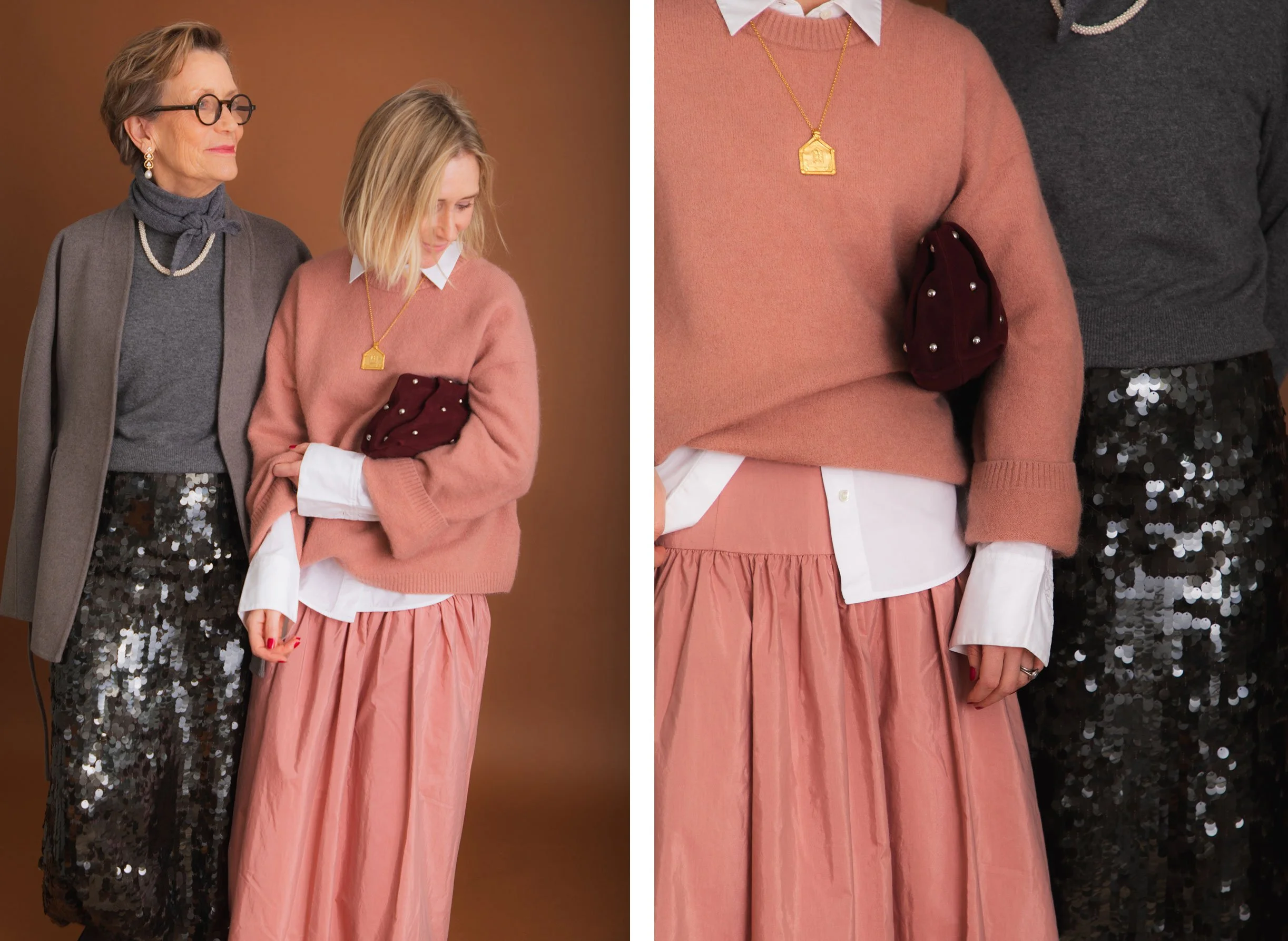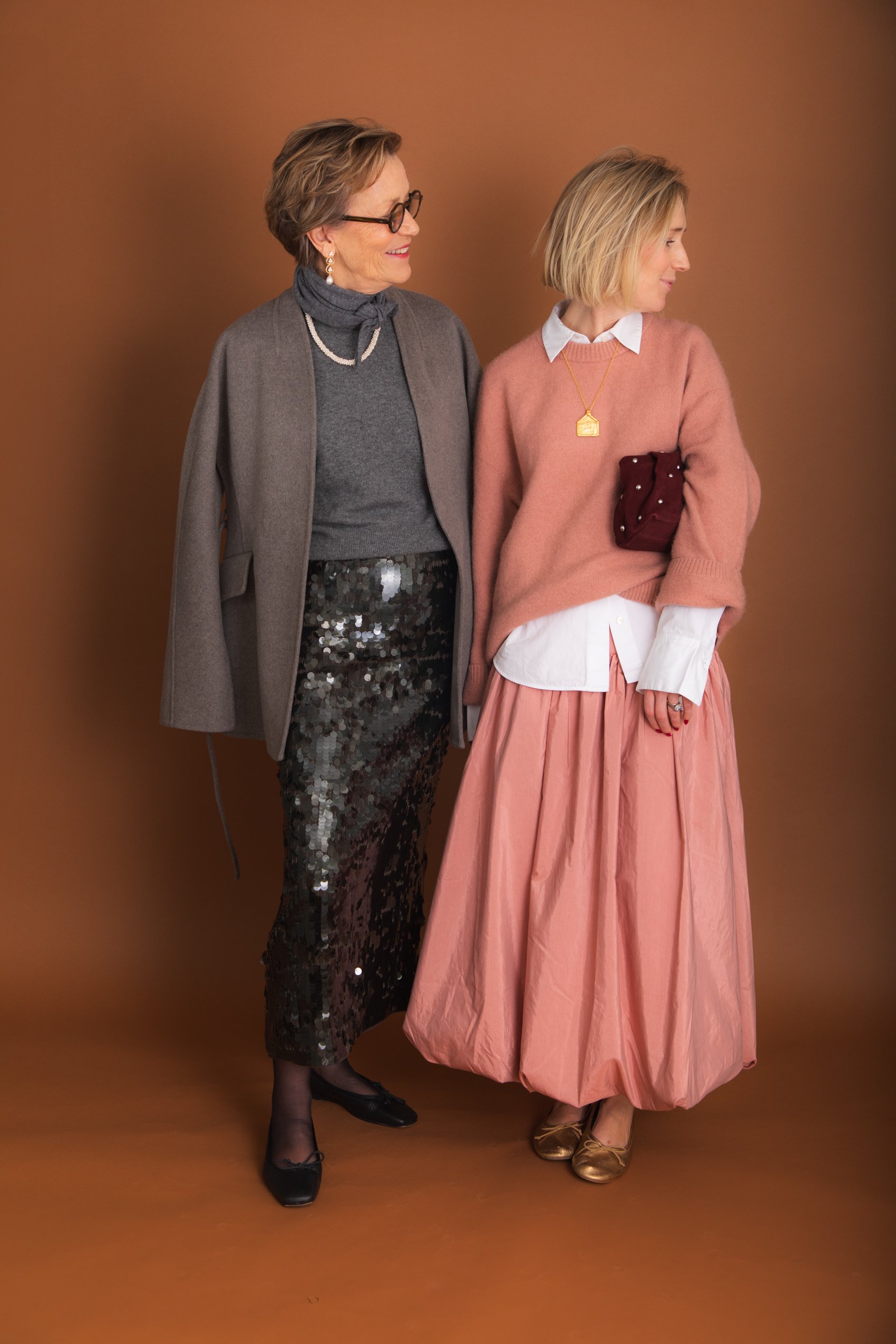 A good outfit is about balance. A balance of proportions, a balance of ‘masculine’ and ‘feminine’ and of dressy to casual. Of course, there are exceptions to this for certain occasions and events, but as a rule, a balance works well. We certainly feel like this when it comes to ‘dressing up’ and the outfits that we are wearing here are a perfect example. Both mum and I are wearing very dressy skirts with casual jumpers.