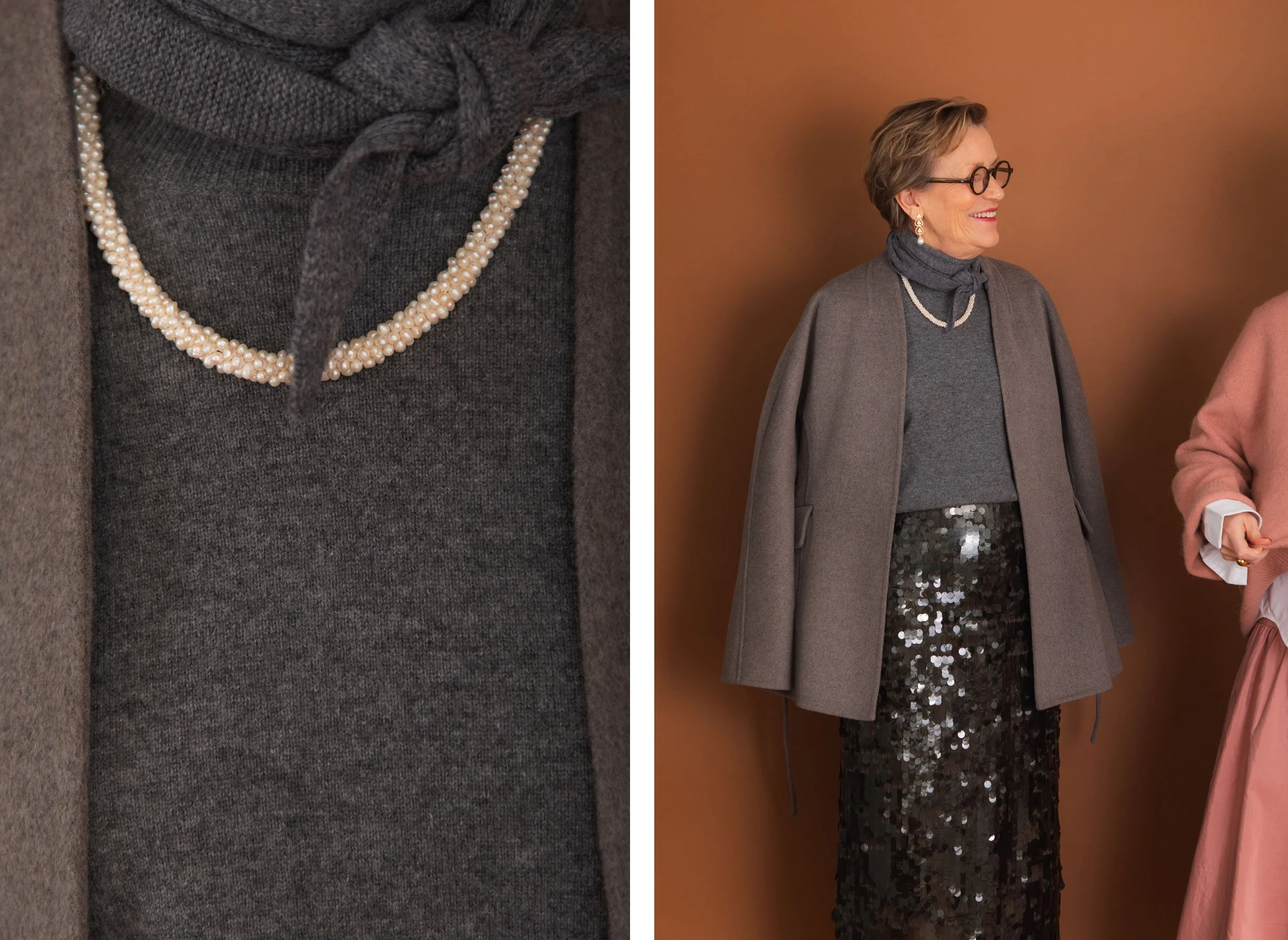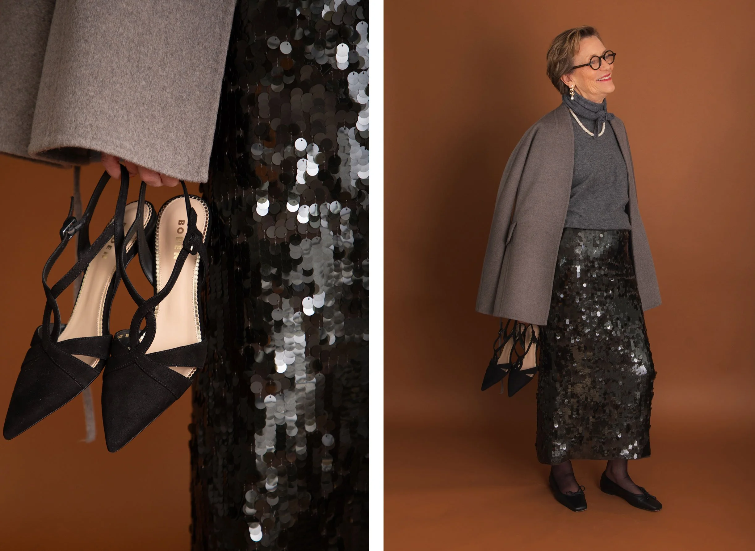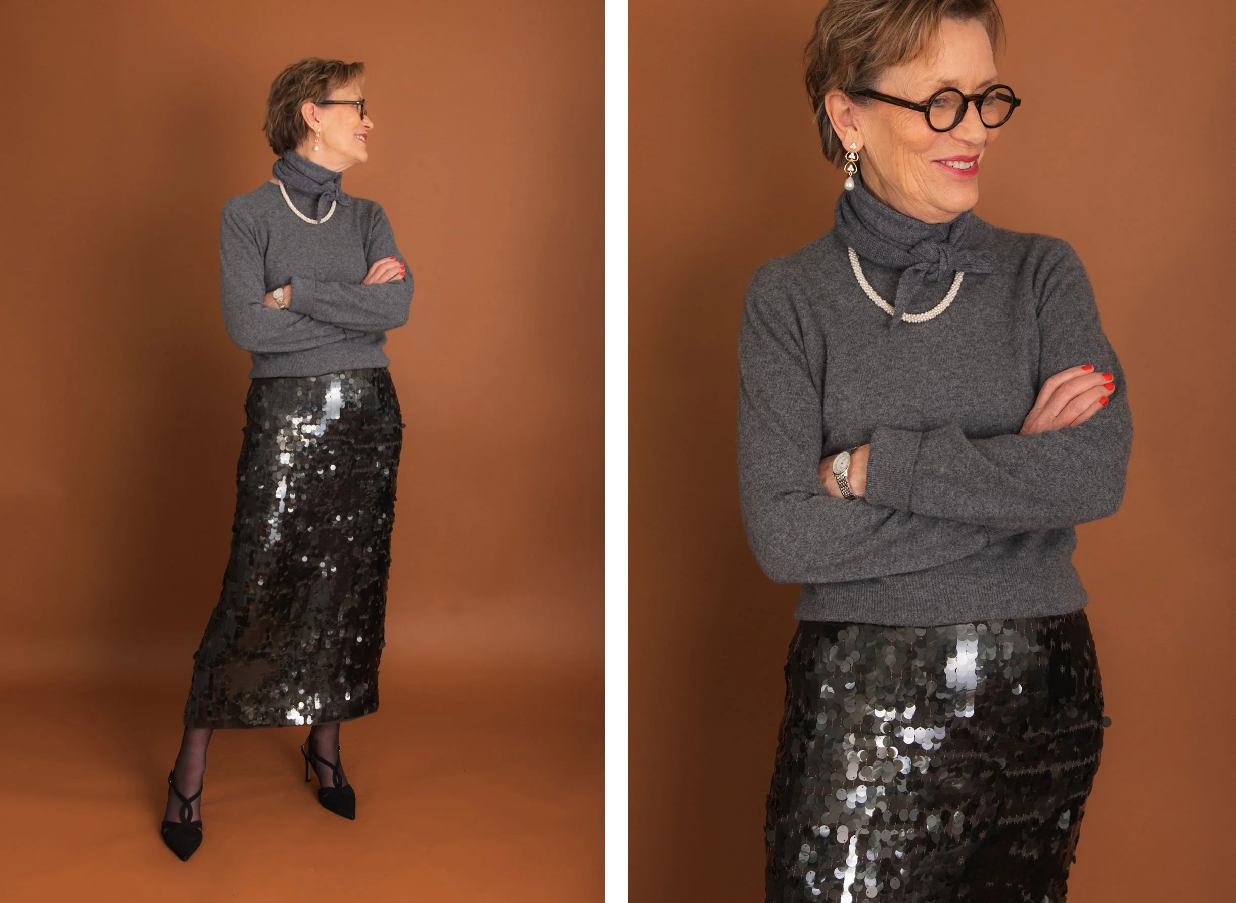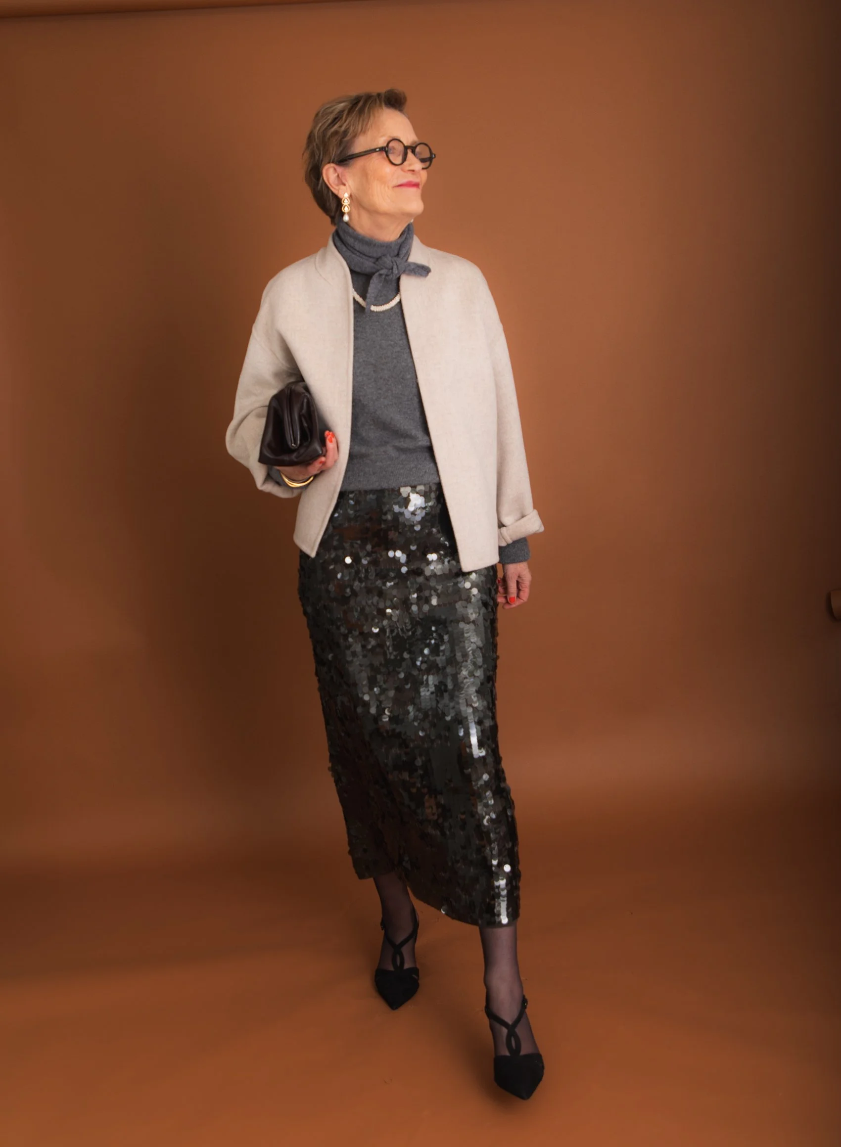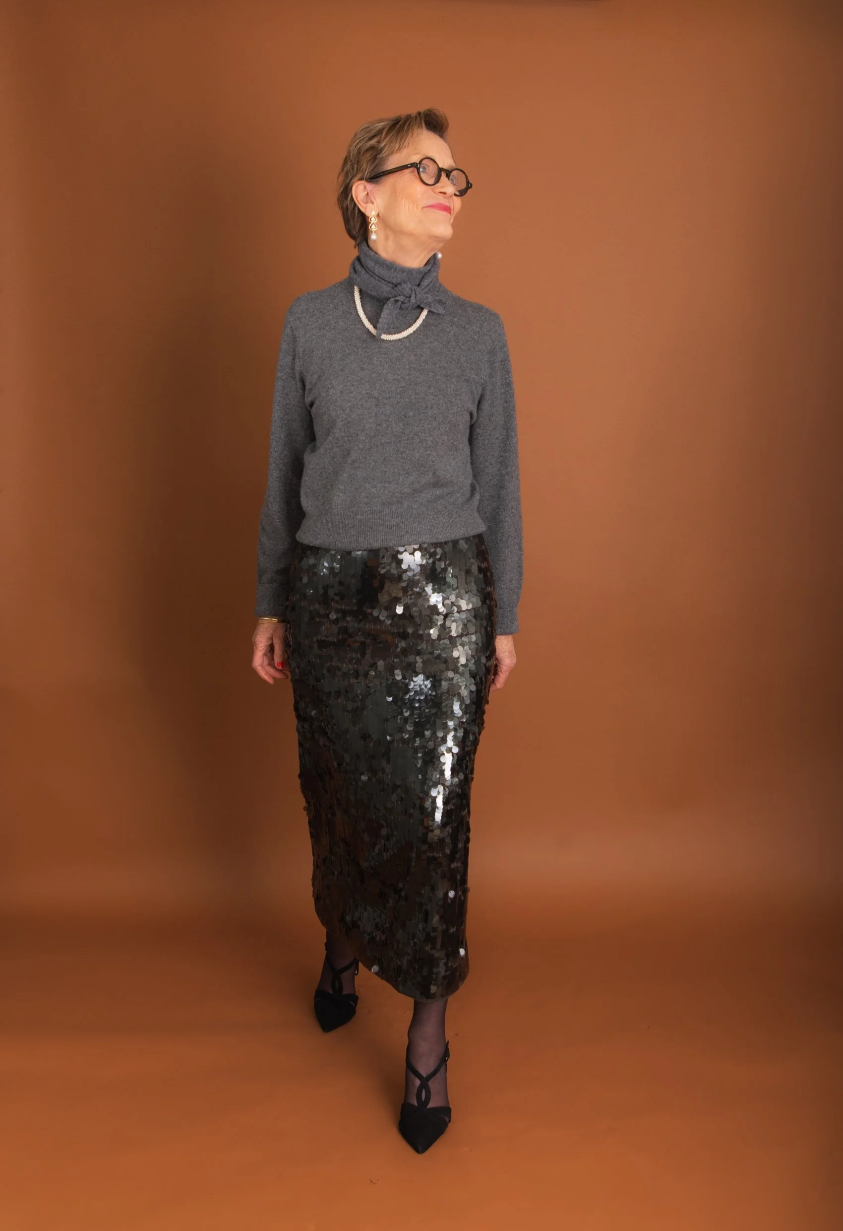 This sequin skirt is actually a very dark green. By keeping the outfit tonal with little difference between the various colours, the interest is created through the mixture of textures. The sequins are grounded by the cashmere and in doing so the overall effect is super chic.