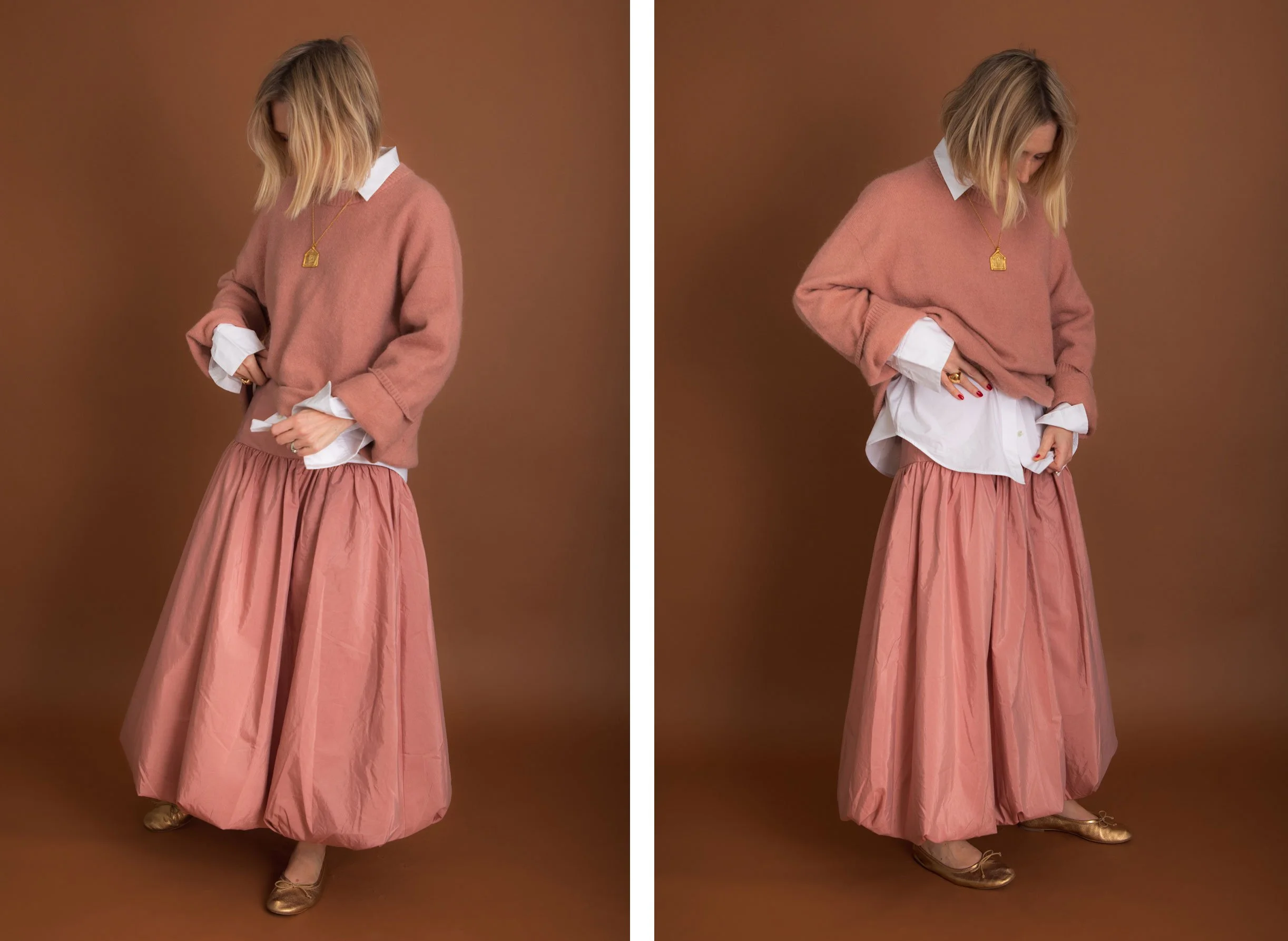 In my opinion, my outfit wouldn’t work without the white shirt. The colour of the jumper and skirt are too similar for the difference in textures to be enough. The crisp white against the dusky pink is clean, fresh and vibrant. I’ve mentioned this before but a shirt/blouse can be an extremely effective way of breaking up an outfit and in doing so, make the individual items sing.