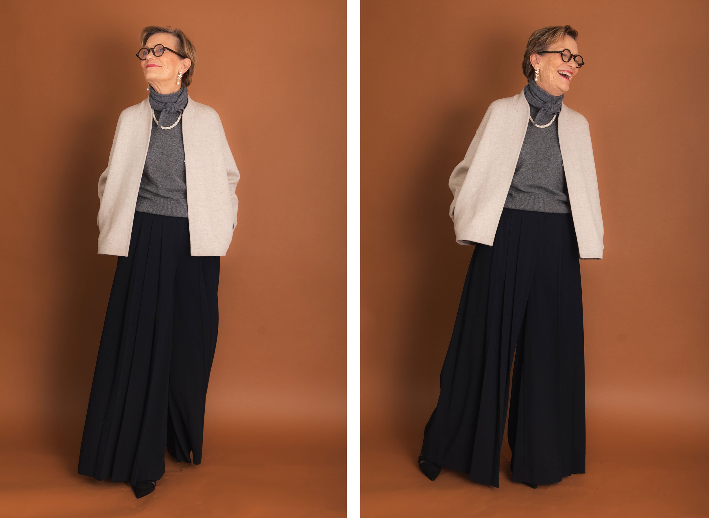 Mum and I can actually take no credit for this ensemble. My sister in law went to Lisbon recently and whilst she was there, spent the evening in a jazz club. That evening there was a lady of a similar age to mum wearing what Kate described as the ‘best outfit in the room’. Having explained the outfit to me I thought oooh, I think that our Graham St followers would enjoy that - and here we are! I think mum looks wicked and I would also wear this outfit in a heartbeat. If you are keen to recreate this look but want to have your tummy covered, choose a slightly boxy, or a-line jumper that sits just below the hips. This would also work extremely well.