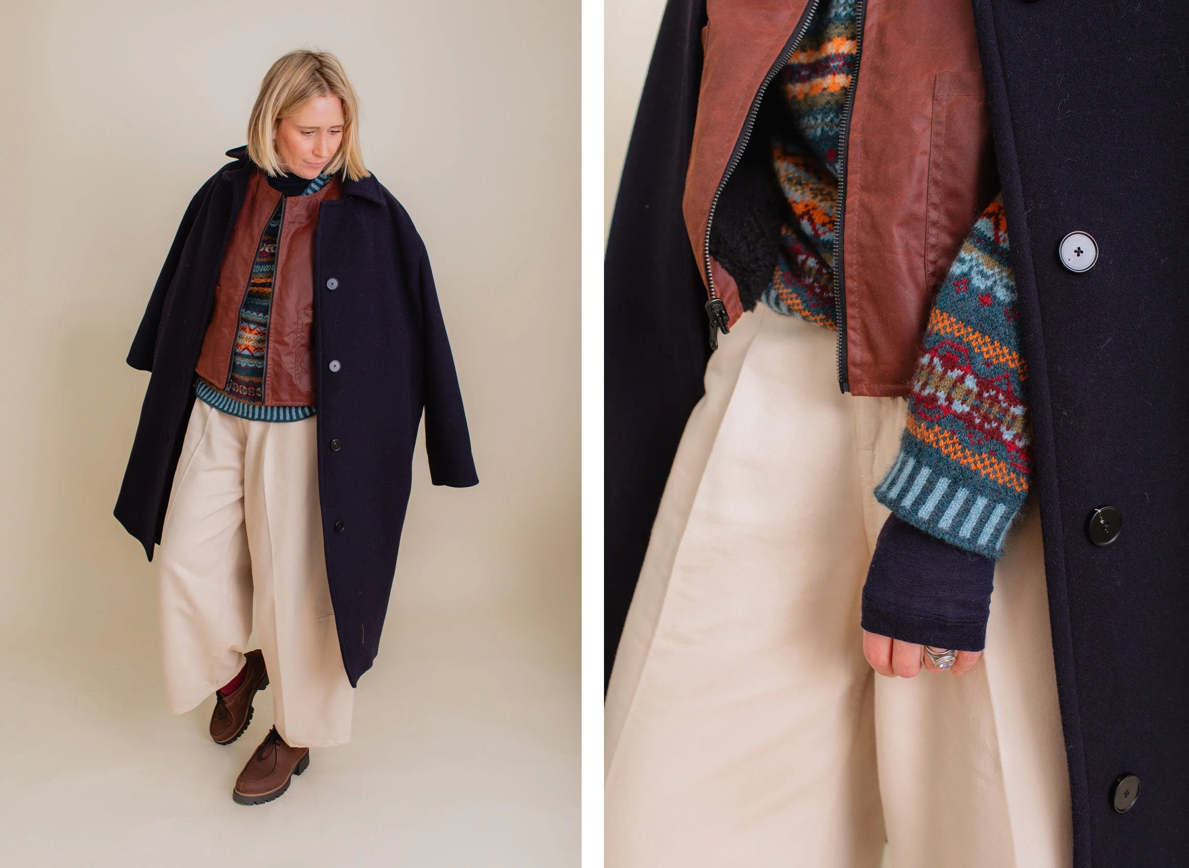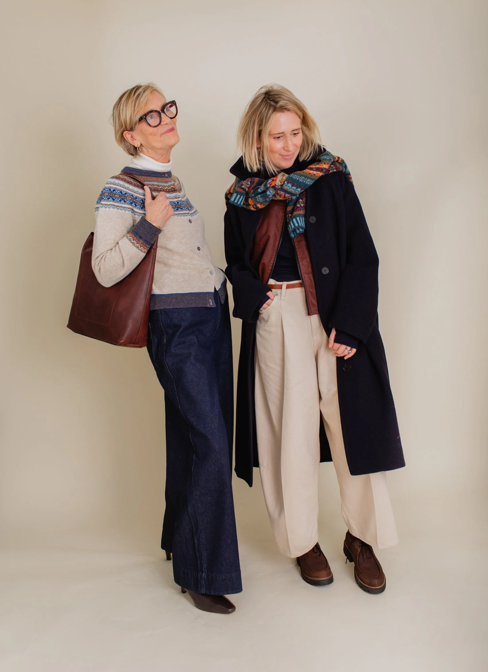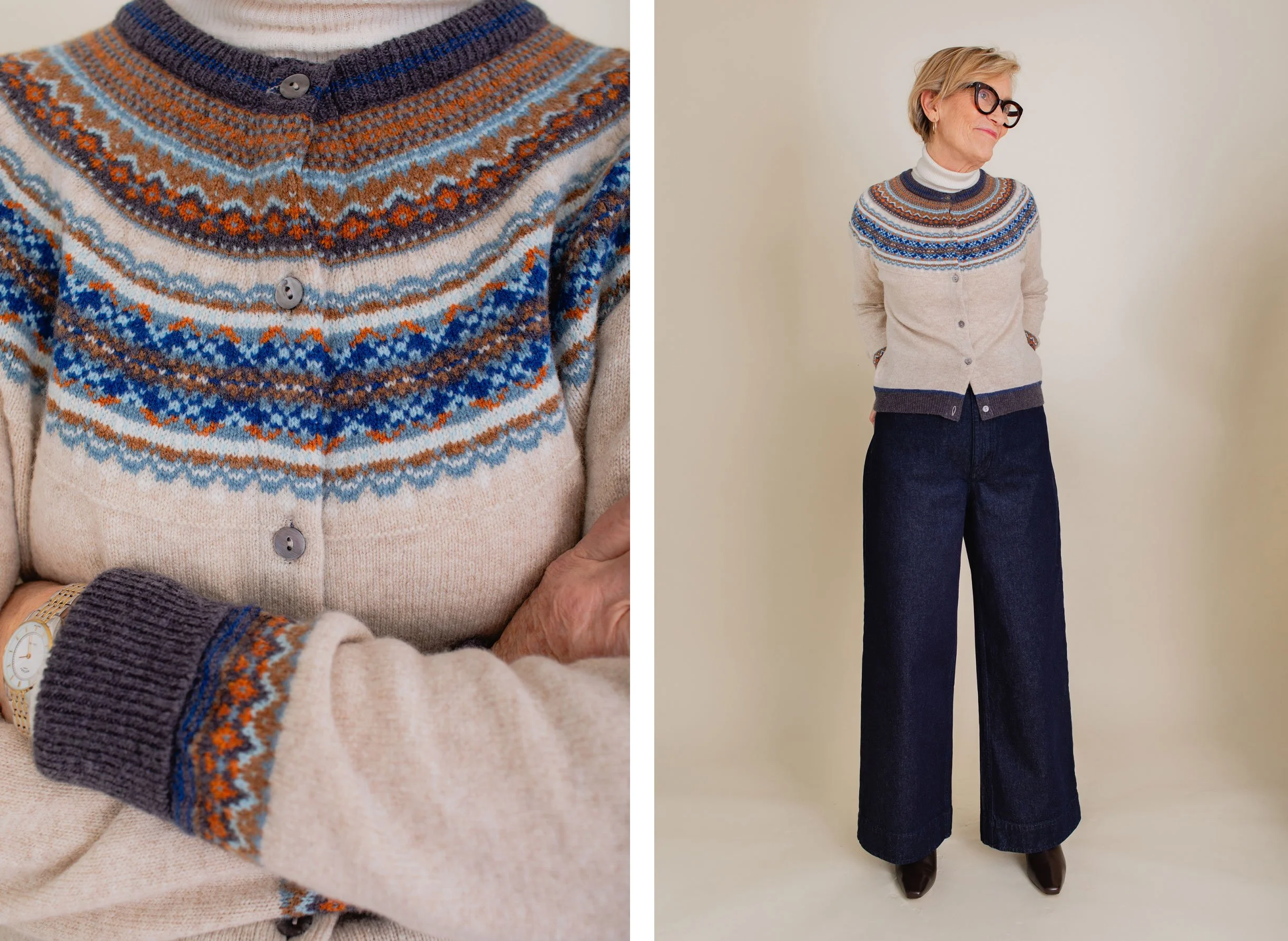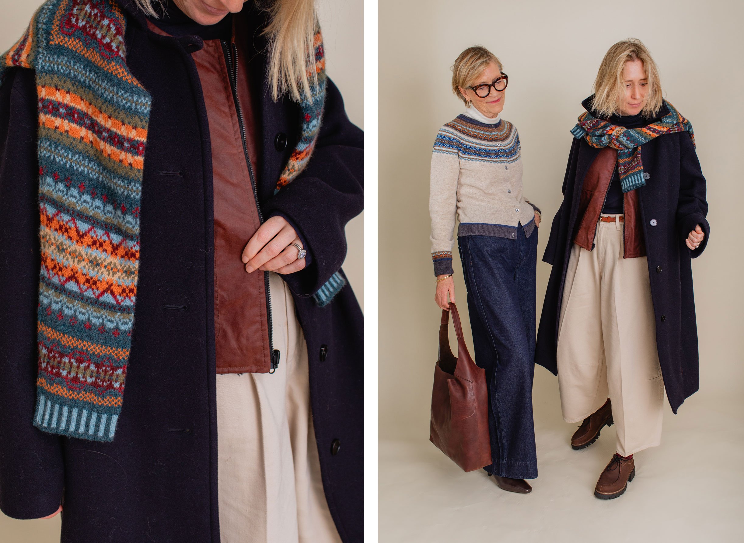 Is there a pattern that marks the coming of winter more than that of Fair Isle? Short of two embroidered Christmas trees and a reindeer sewn onto your top, a Fair Isle jumper is the sign that winter has arrived! This knitting technique originating from Fair Isle (a remote island in the Shetland archipelago of Scotland) is one of my favourites. My jumper and mum’s cardigan are by a brand called Eribé, a craft manufacturer based in the beautiful border lands of Scotland.