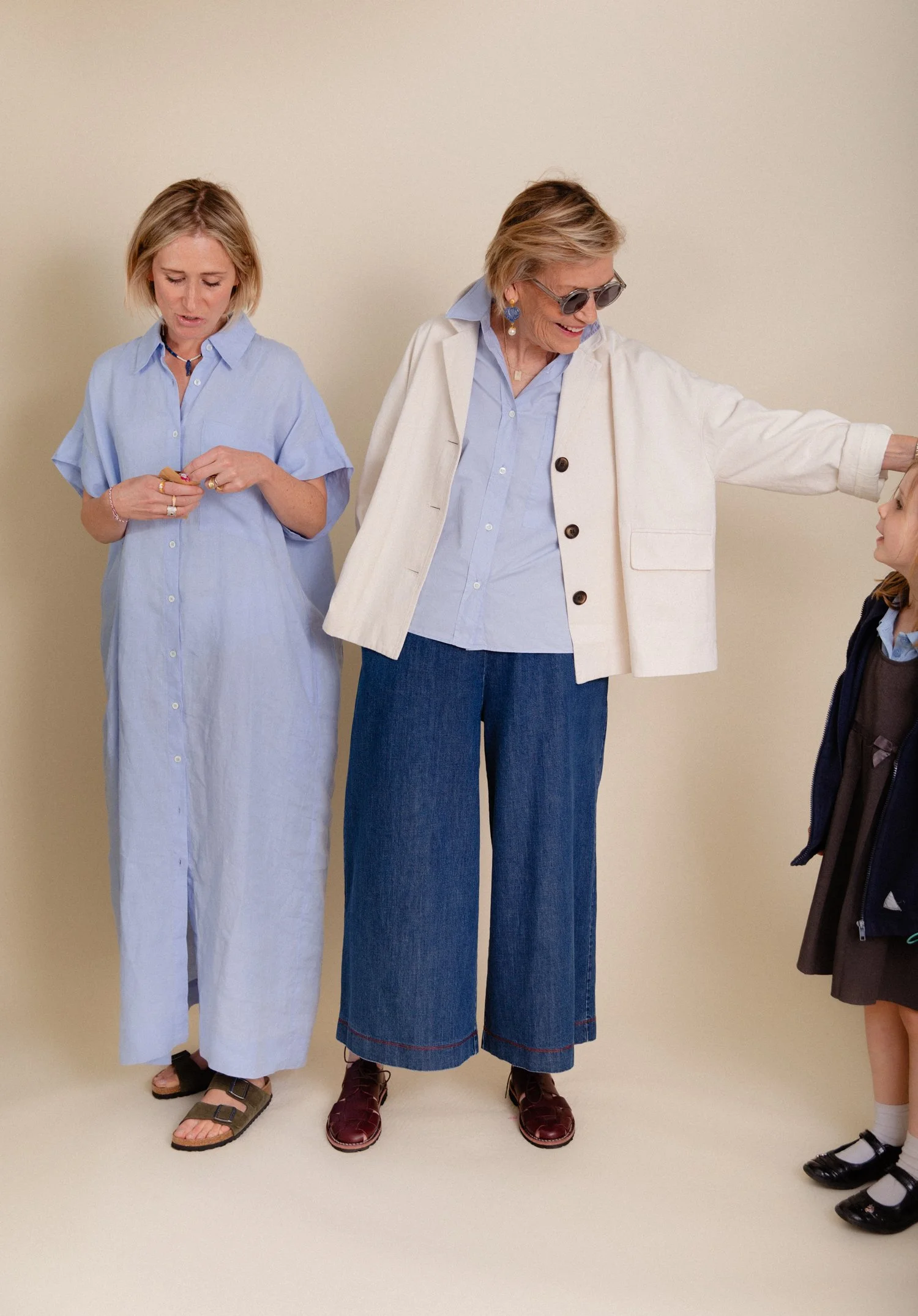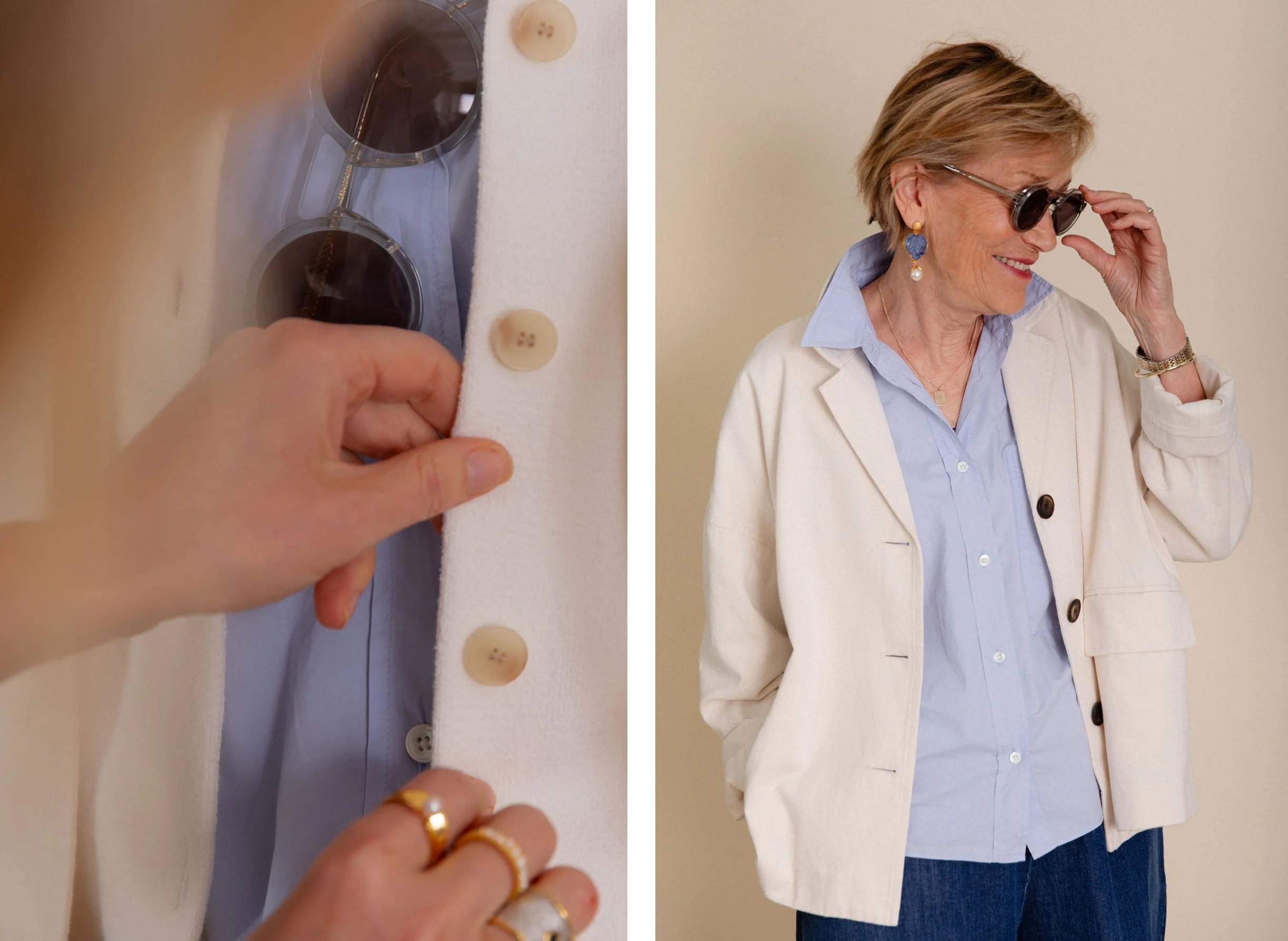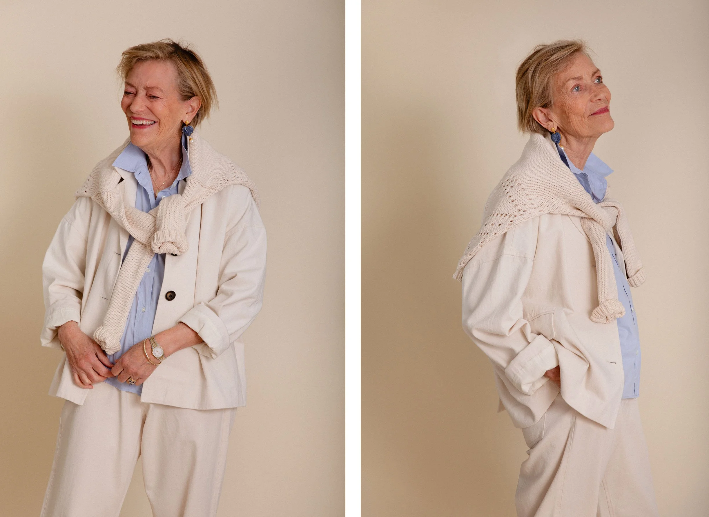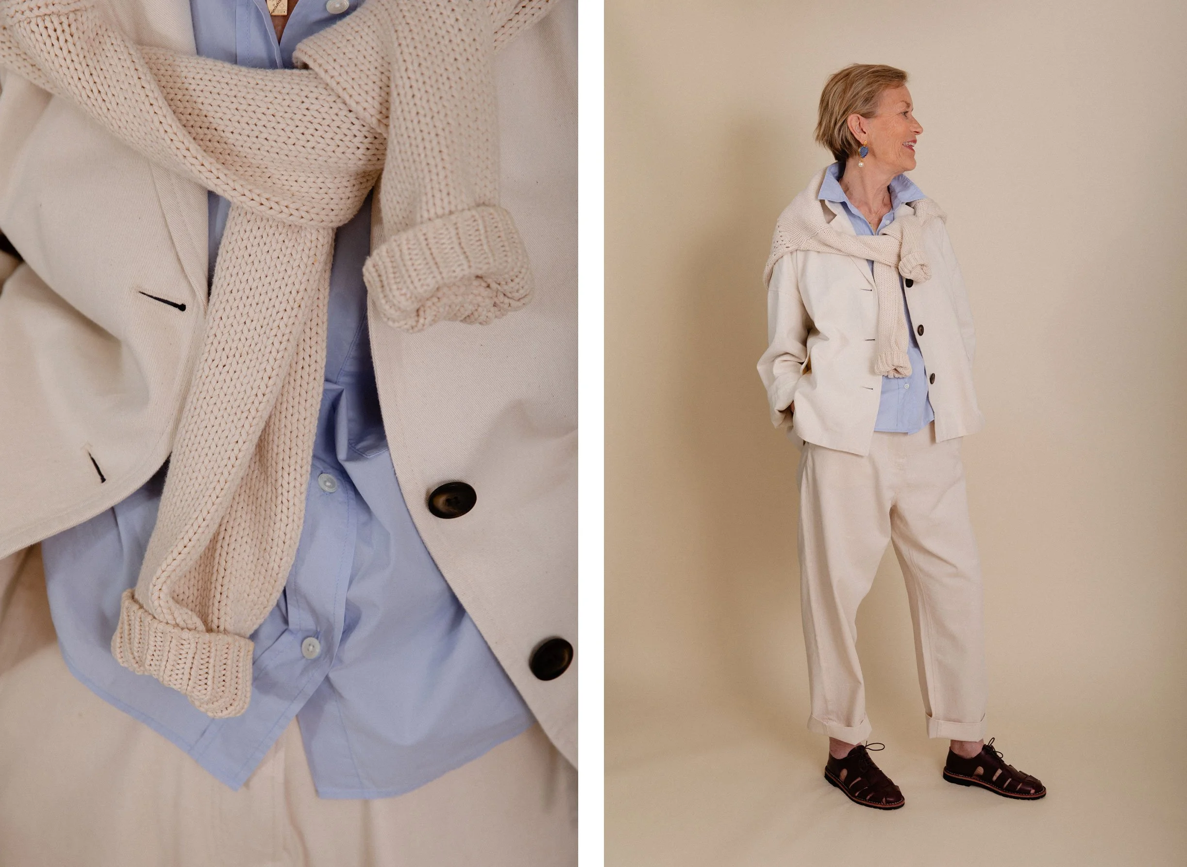 We also paired mum’s top half with different trousers to demonstrate versatility. There is no point in having a jacket in your wardrobe that you can only wear one way. It is good to get as much wear out of your clothes as possible. I find it satisfying to see how different pieces look worn with different things. The blue of the denim culottes worn with the cream jacket is a very satisfying and fresh colour combination.