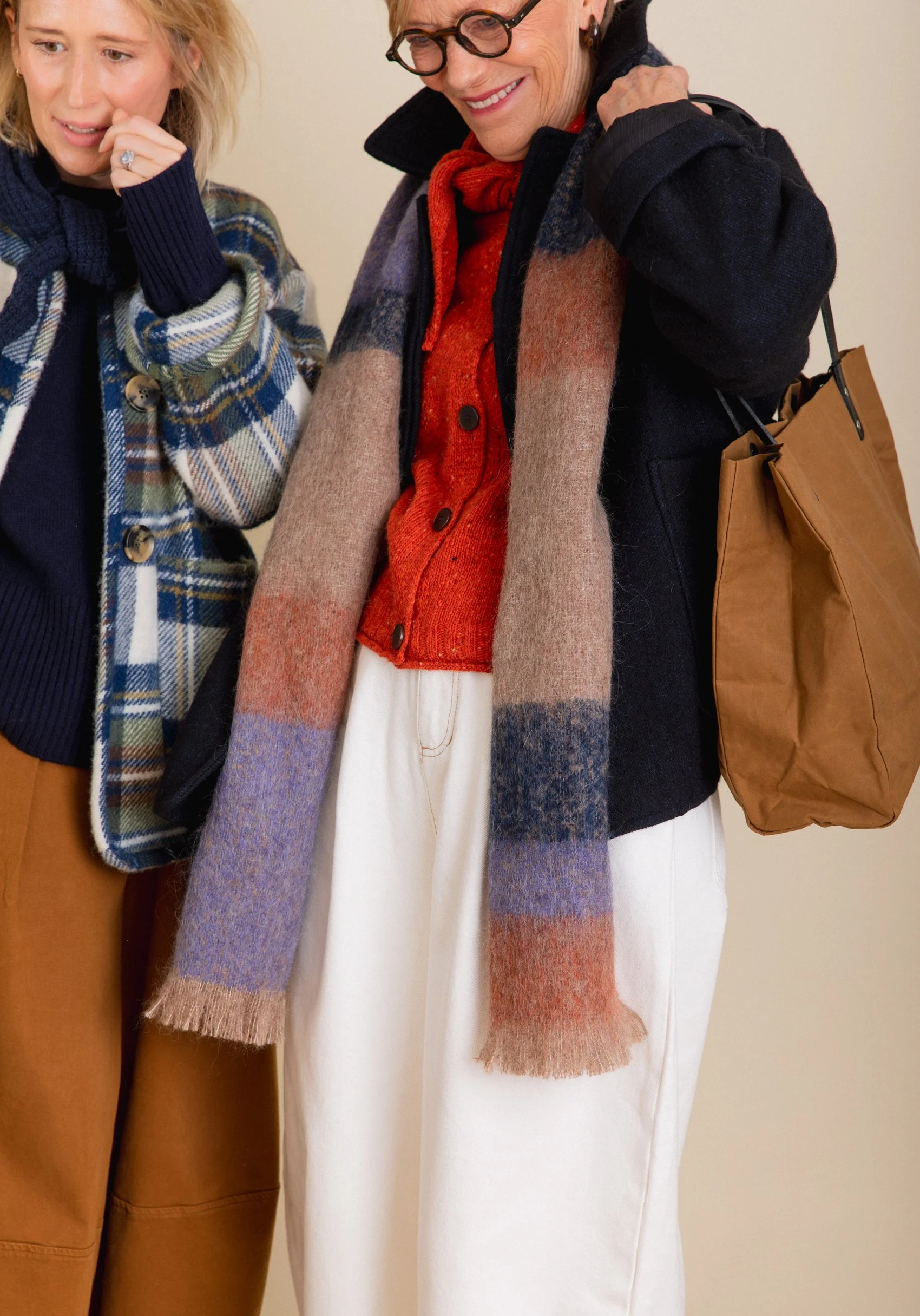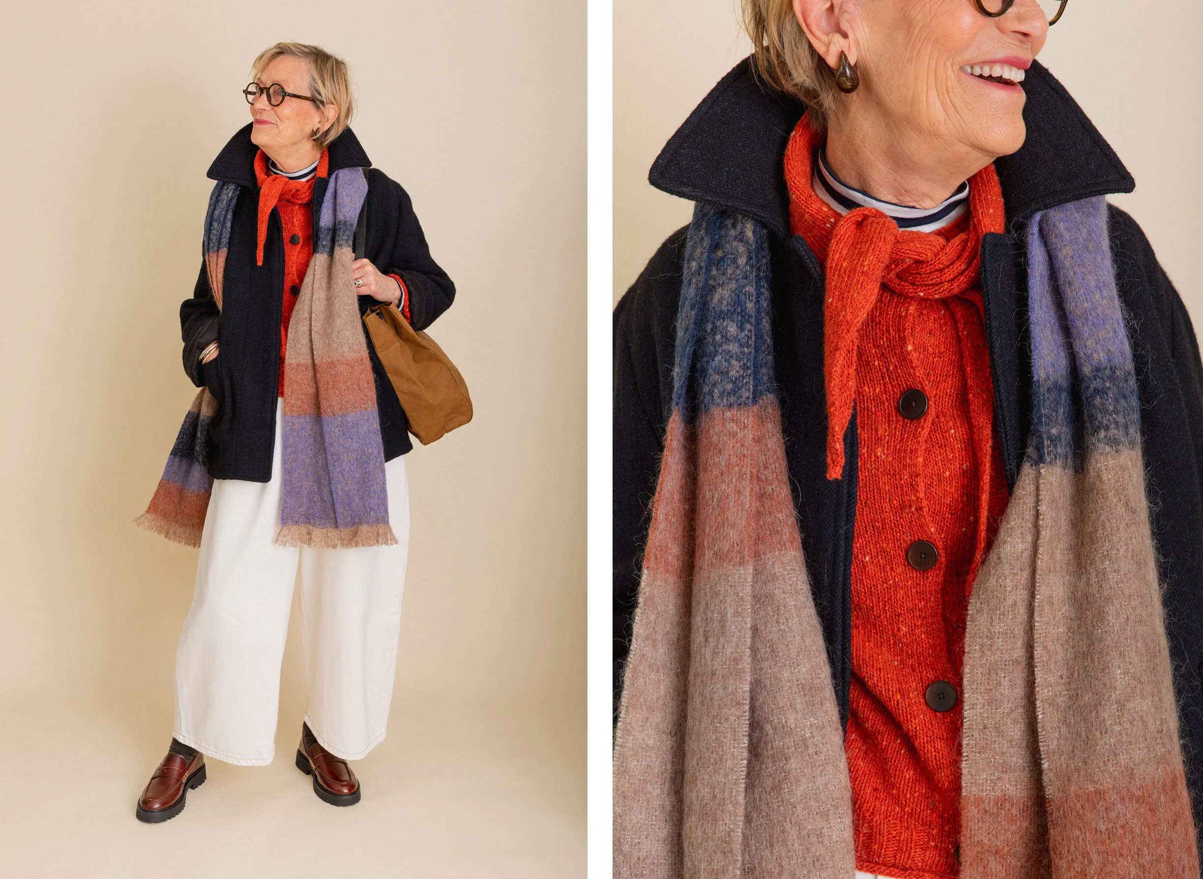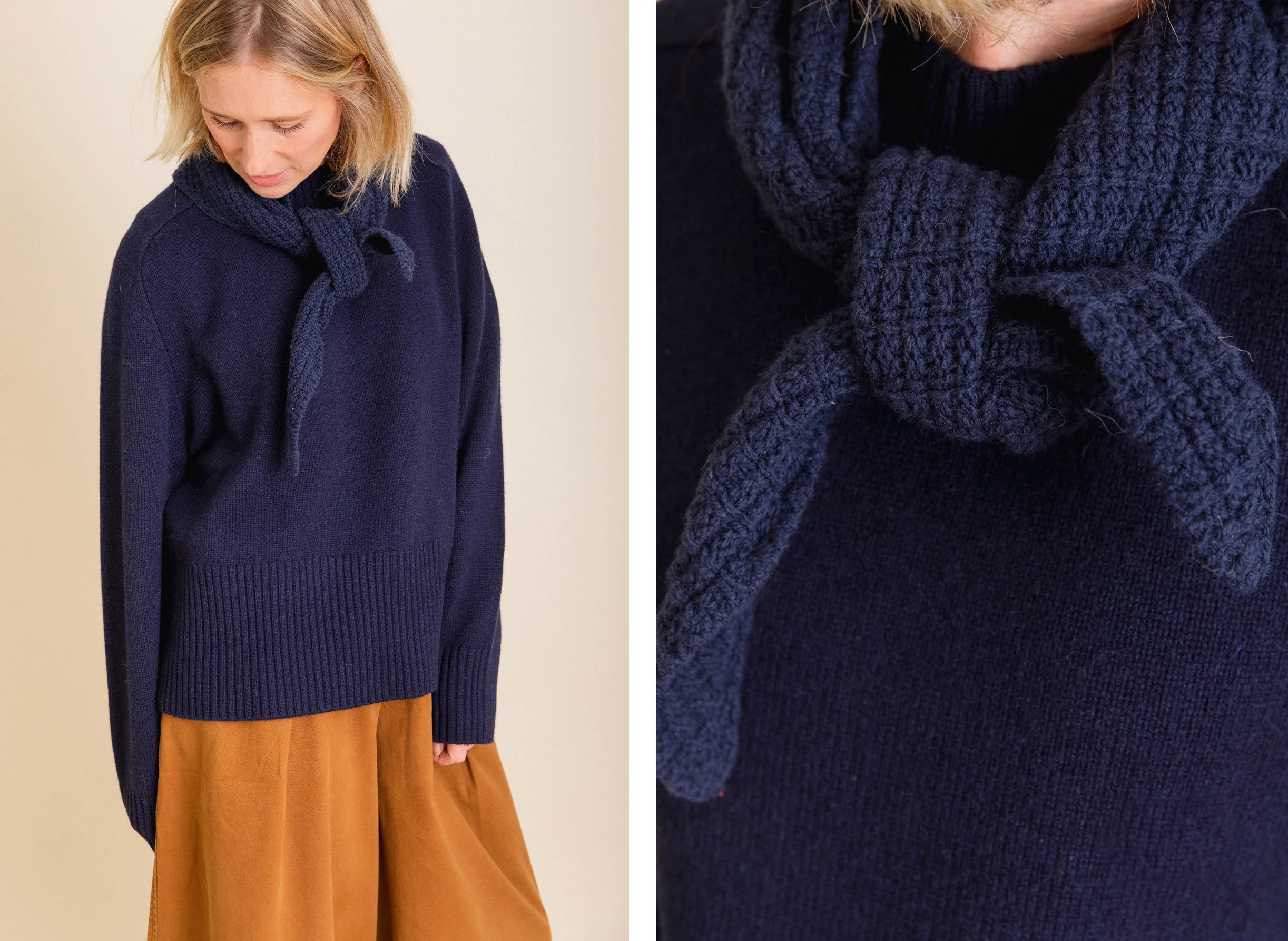 There are so many lovely knitted neckties available this season. They are such a great way to finish off an outfit while also providing some warmth. I particularly love the look of a matching jumper and necktie, there is something very elegant about this combination. I am wearing a navy jumper from Rise & Fall (more on this later) with a scarf from L’Envers. The waffle knit of the scarf contrasts beautifully with the flat texture of the jumper. It goes without saying then, that we both love mum’s cardigan from Toast. Not only is it a fabulous colour but the necktie is integral to the cardigan (no slipping off and losing this one!).