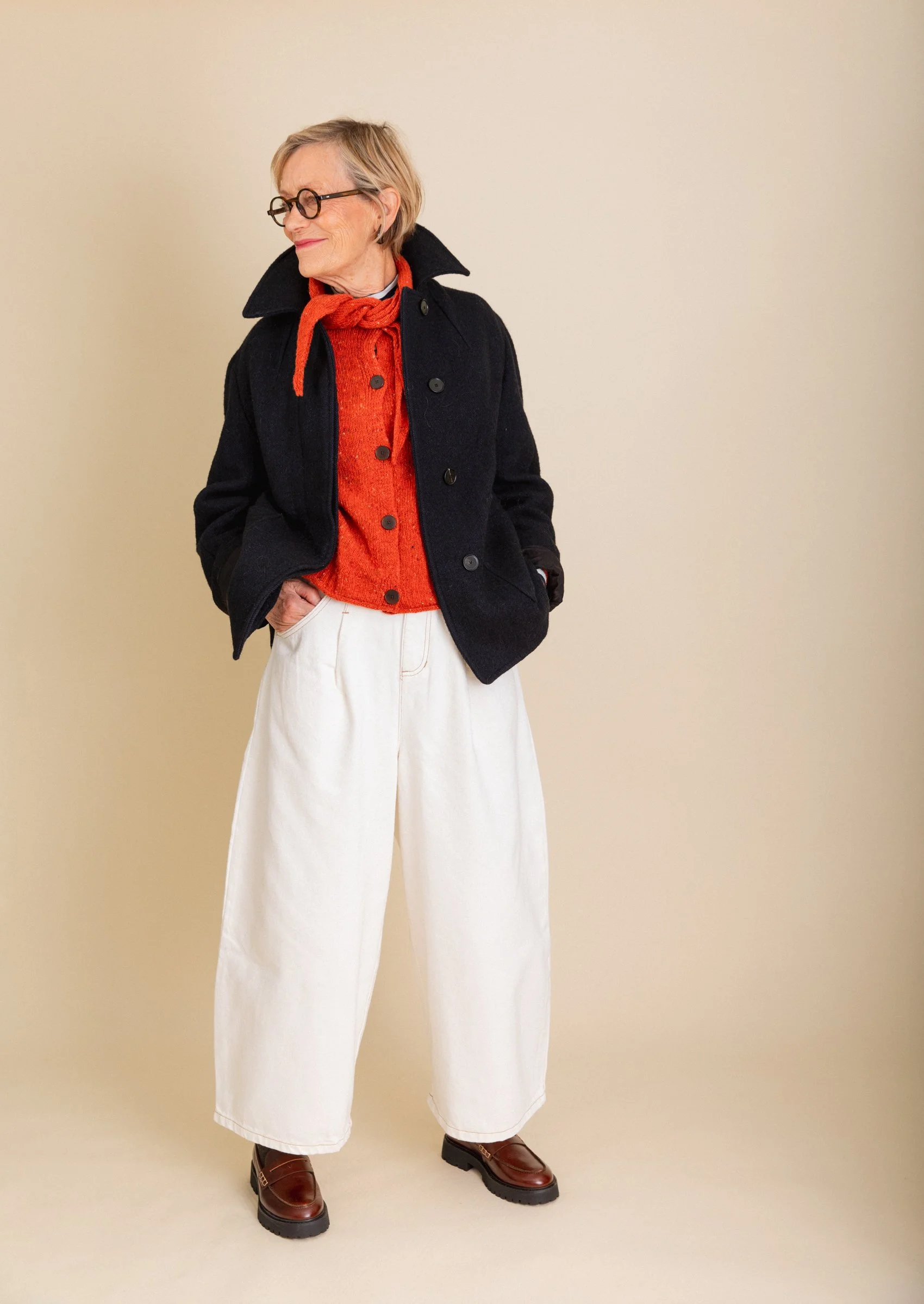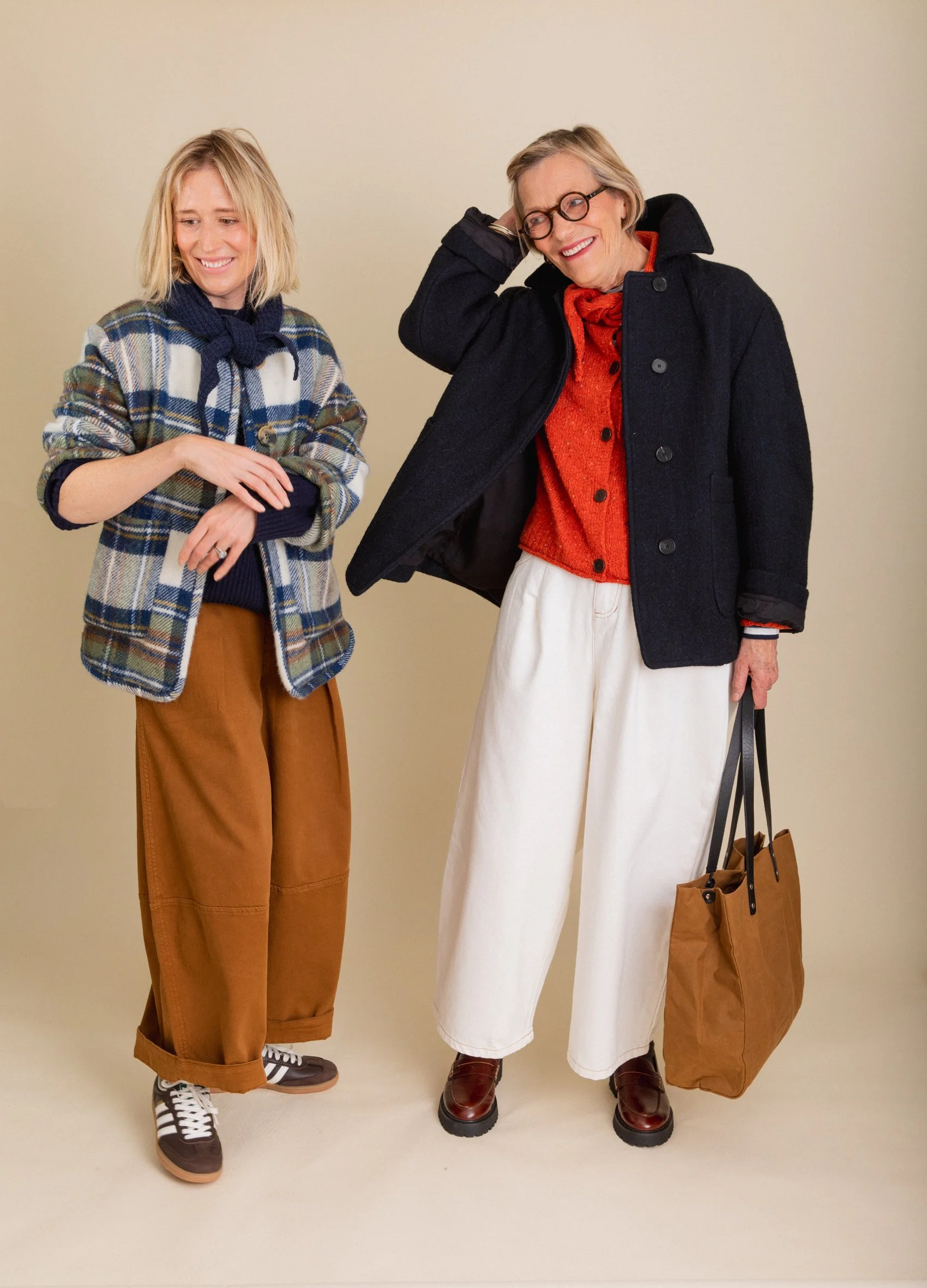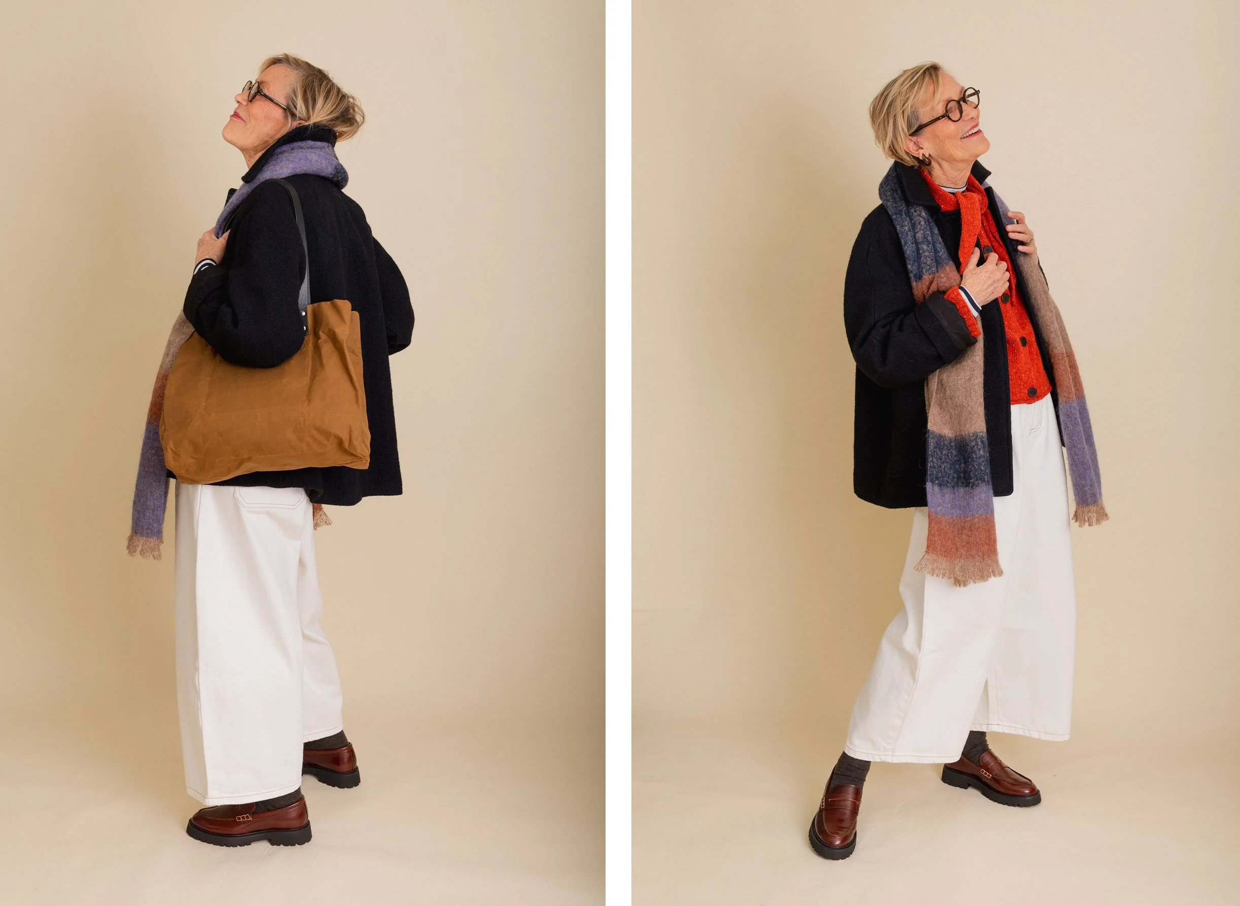 Ultimately, it is the shape of your trousers that will dictate the overall vibe of an outfit. The more directional the shape, the more modern the look. Conversely, the more classic the silhouette, the more classic the overall look. There is no ‘right or wrong’, ‘good or bad’ it’s just personal taste. I’m making the point because sometimes it’s difficult to know why an outfit looks a certain way. If you compare mum’s outfit last week to the one that she is wearing here, the top half of both are not dissimilar, it is the shape of the trousers that are very different. The L.F. Markey pair are a wide, contemporary cut while the Jaeger trousers are slim, tapered and more traditional in shape. We love both looks and I think that both styles suit mum well.