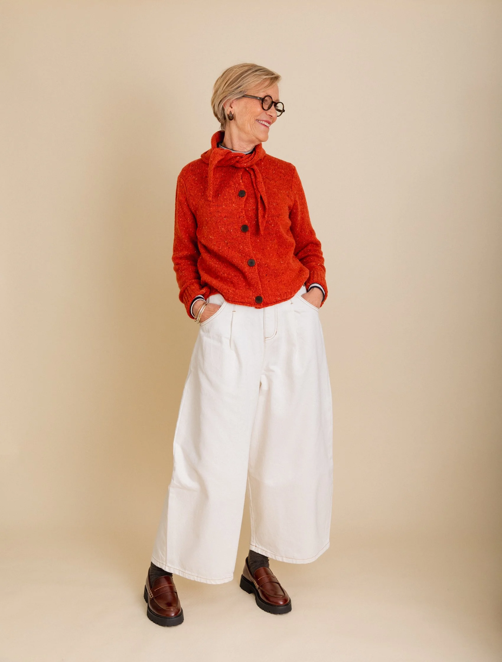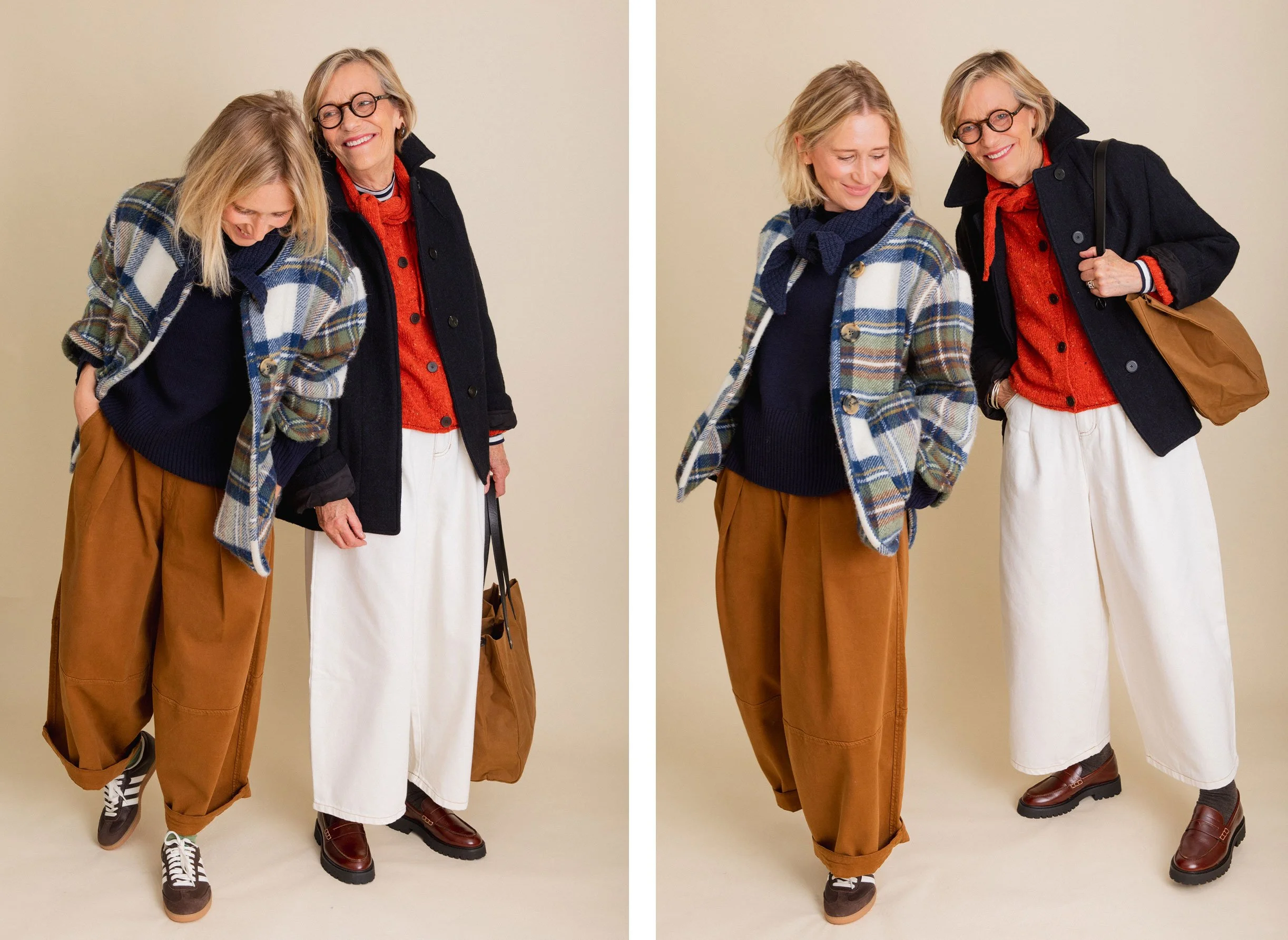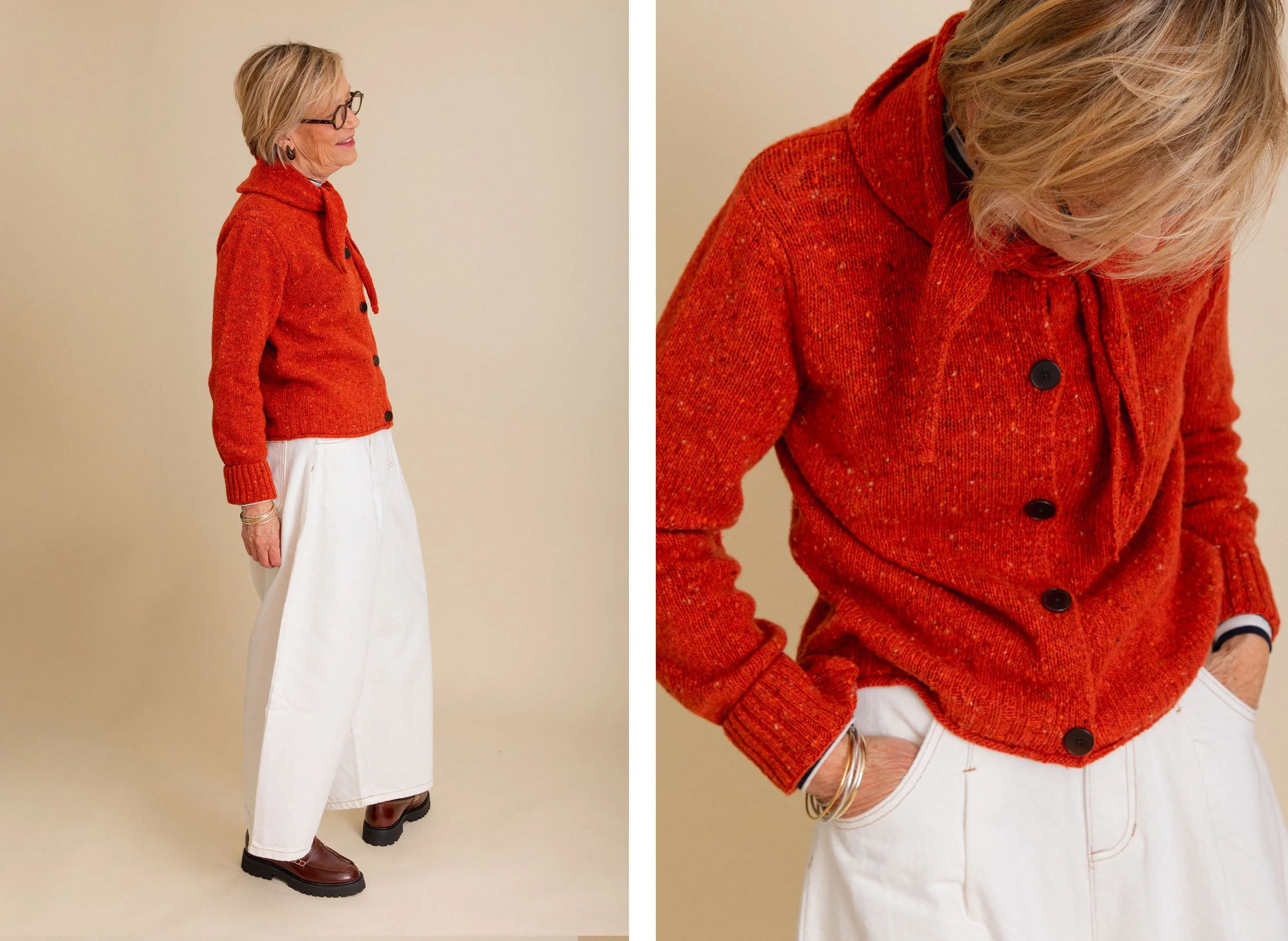 Ultimately, it is the shape of your trousers that will dictate the overall vibe of an outfit. The more directional the shape, the more modern the look. Conversely, the more classic the silhouette, the more classic the overall look. There is no ‘right or wrong’, ‘good or bad’ it’s just personal taste. I’m making the point because sometimes it’s difficult to know why an outfit looks a certain way. If you compare mum’s outfit last week to the one that she is wearing here, the top half of both are not dissimilar, it is the shape of the trousers that are very different. The L.F. Markey pair are a wide, contemporary cut while the Jaeger trousers are slim, tapered and more traditional in shape. We love both looks and I think that both styles suit mum well.