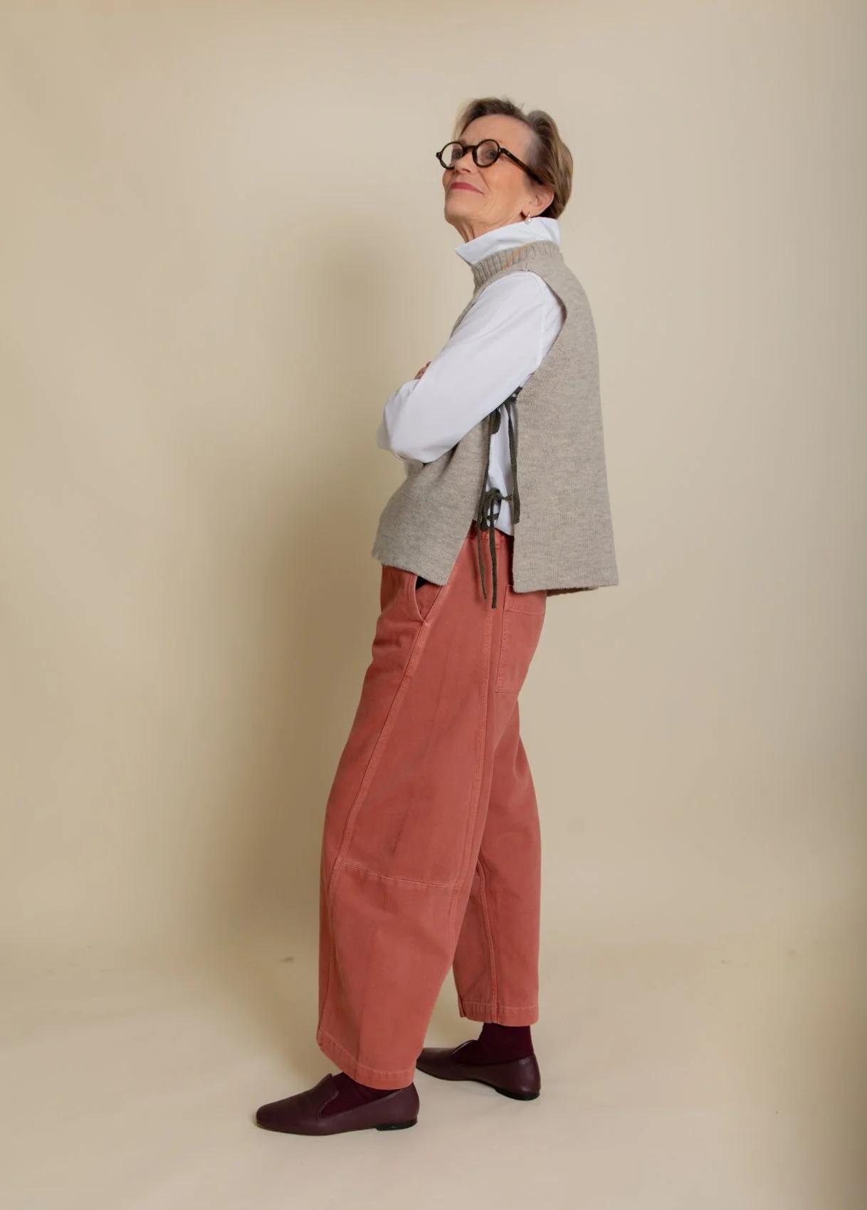 Slightly unusual coloured trouser can often be an interesting way of mixing things up. The pair that mum is wearing are by Beyond Nine. This slightly washed out salmon pink is gorgeous. Suitable for winter and summer, they would represent a good investment too. Beyond Nine are known for their comfort - the waist of these jeans is elasticated- but I also think that the quality of their clothes is extremely good. The sizing is very generous. For example, mum is a UK10 and wearing a 2XS.