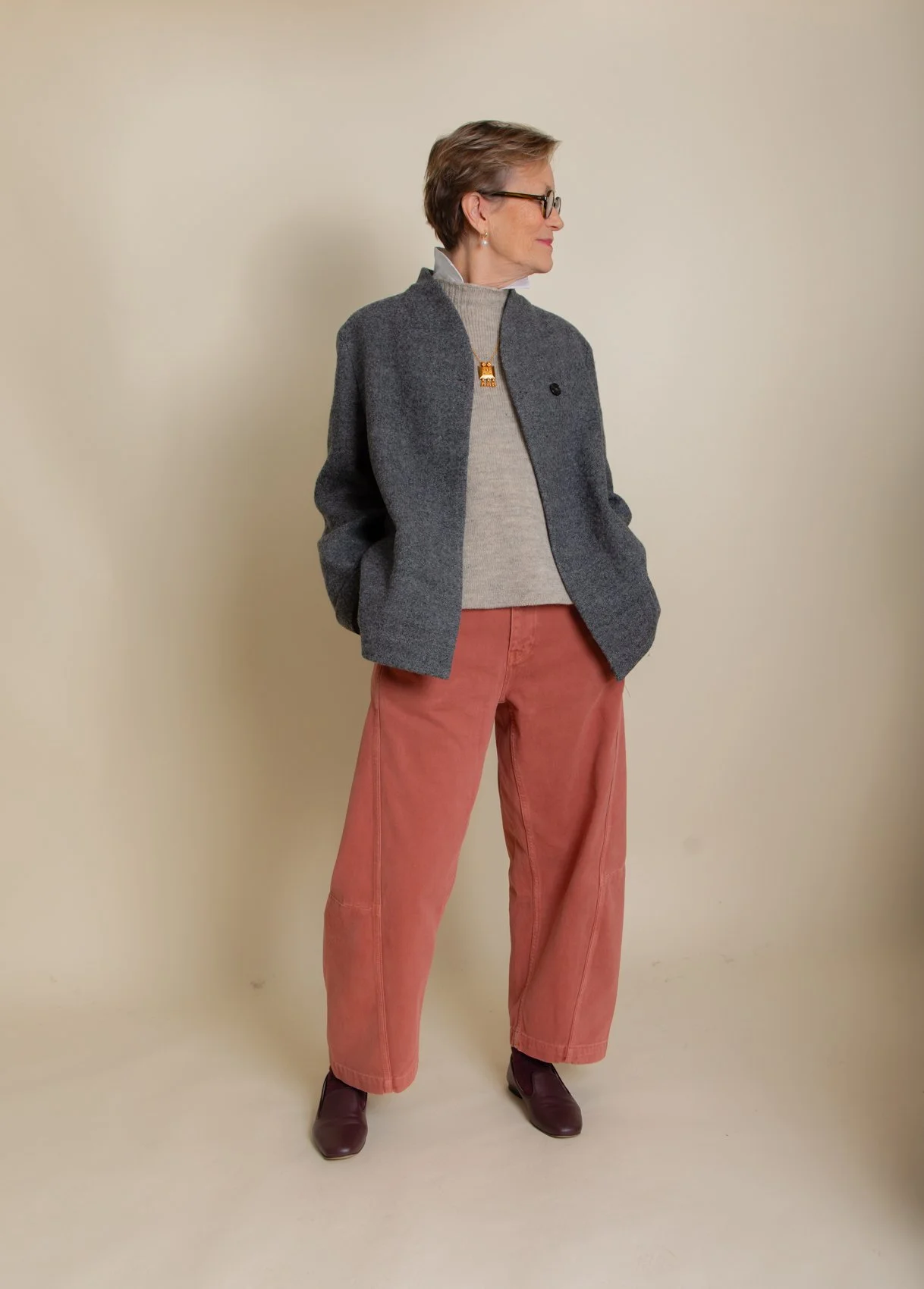 You will notice that both this coat and the grey jacket that mum is wearing have crisp, sharp shoulders. As we age, I do think that this particular silhouette is very flattering. It provides a sharp, cool edge to any look.