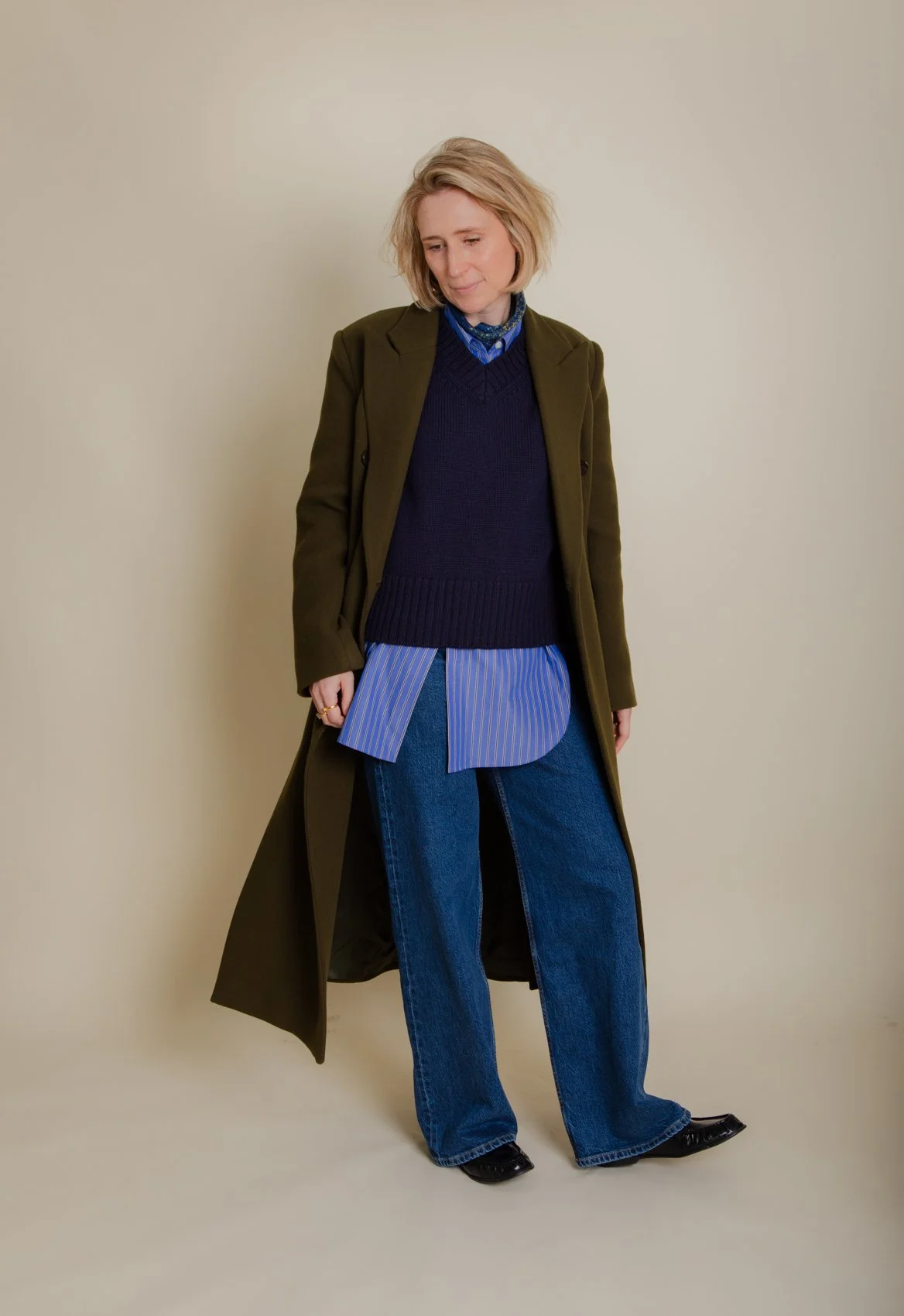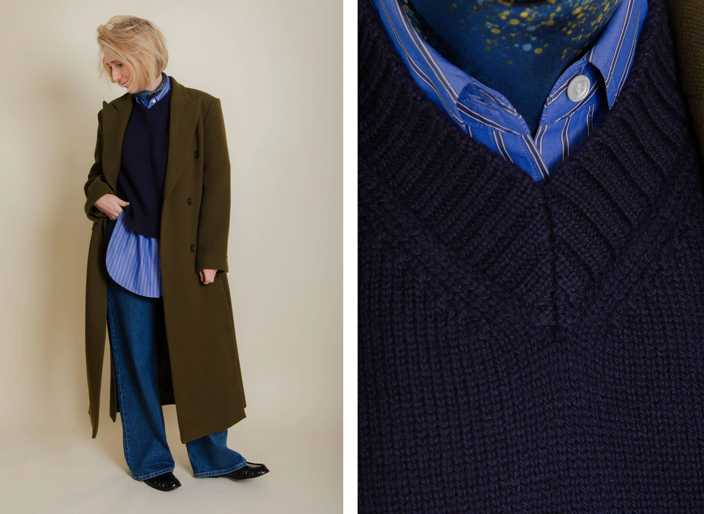 Mum and I both love this coat. Army green is such a fantastic colour for outerwear - less heavy than black, navy and dark grey but just as versatile. It has large side slits which provide a cool, modern detail. It’s designed to be worn oversized on the shoulders (think 80’s ladies) but I have sized down so that it fits more neatly. This is a UK6 and I am a UK8/10.