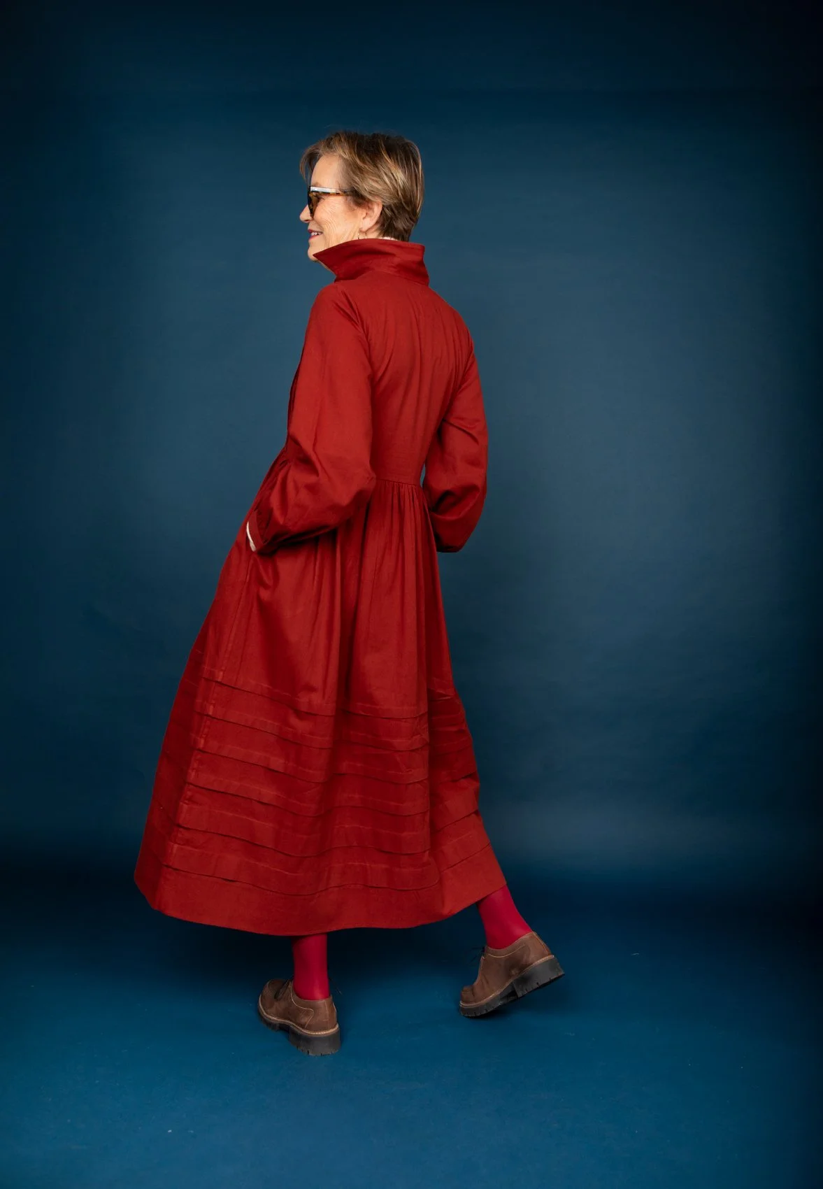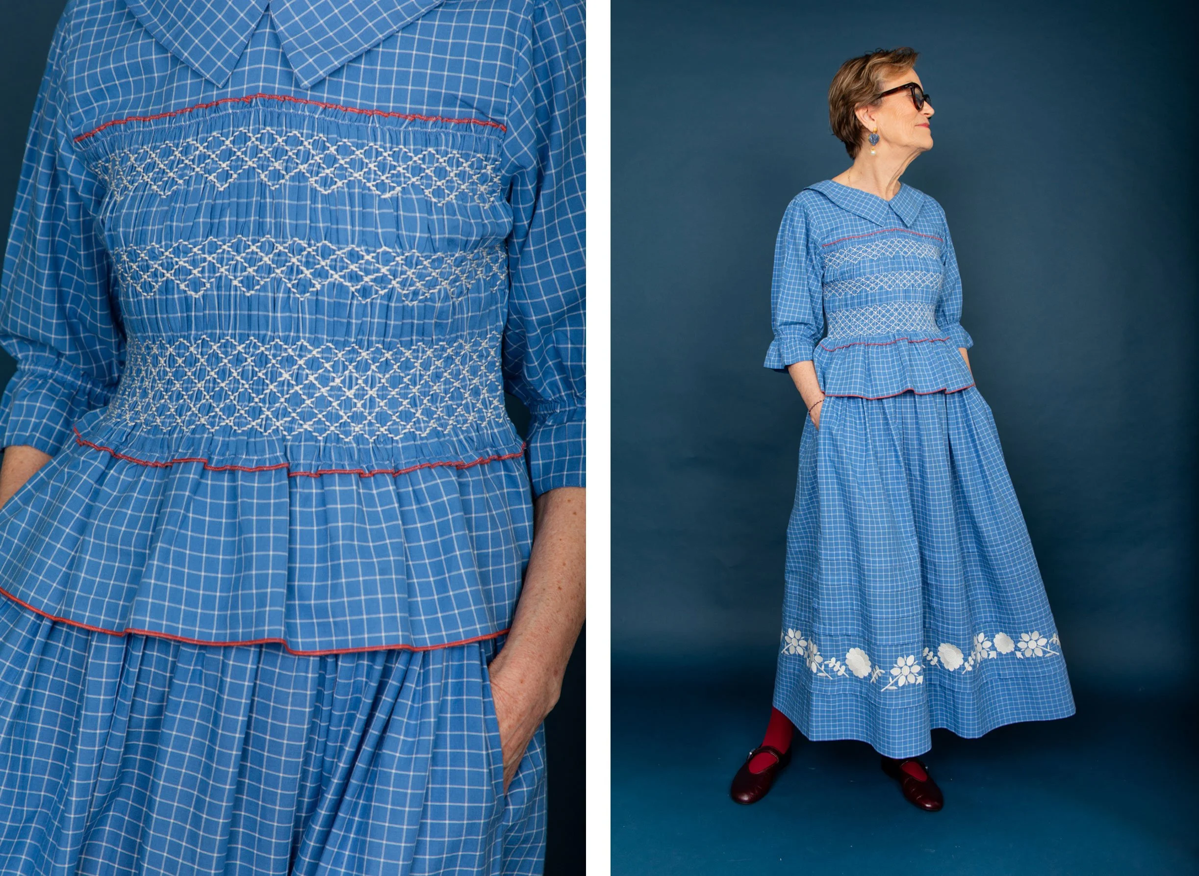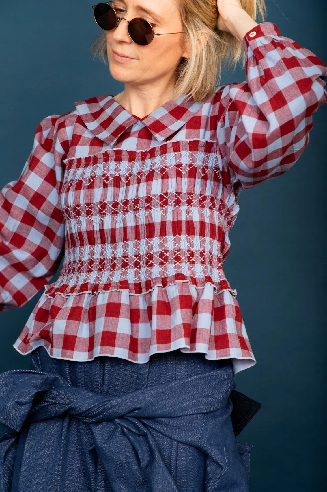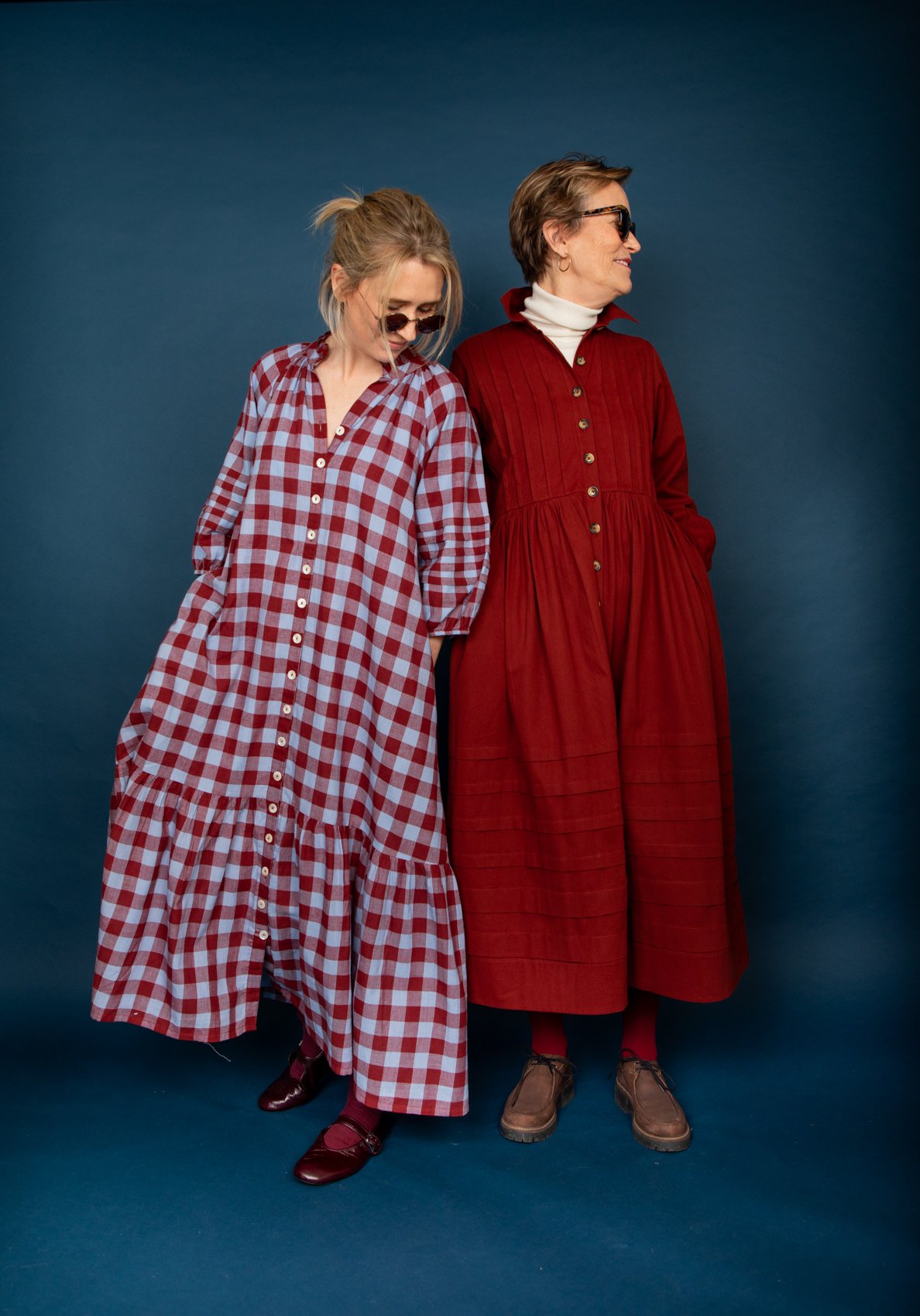 Look at the stunning detail on these smocked tops. The over-locked seams of the smocked panel coupled with the criss-cross stitched pattern is so striking. What perhaps you can’t see here is how pretty the design around the neckline is. The collar dips just low enough to see the top of your collar bone which is delicate and flattering. And lastly, what a scrumptious colour combination this deep red and sky blue is together! Woven in Bengal, East India, the effect is as vibrant as the city in which the fabric was made.