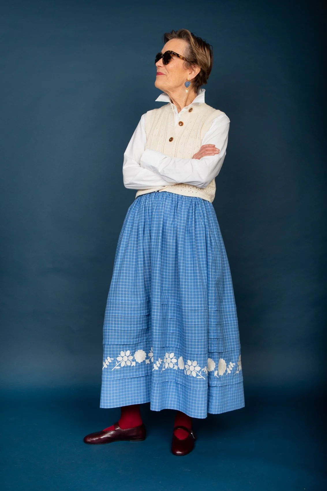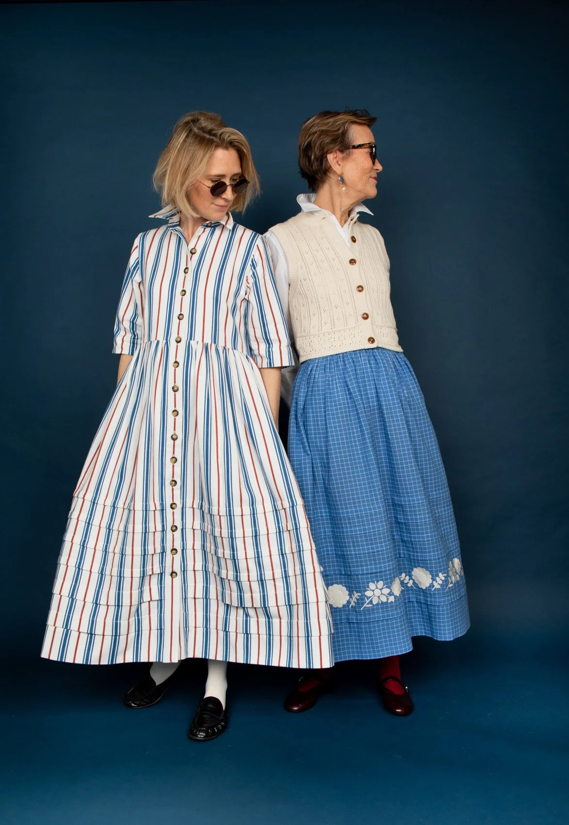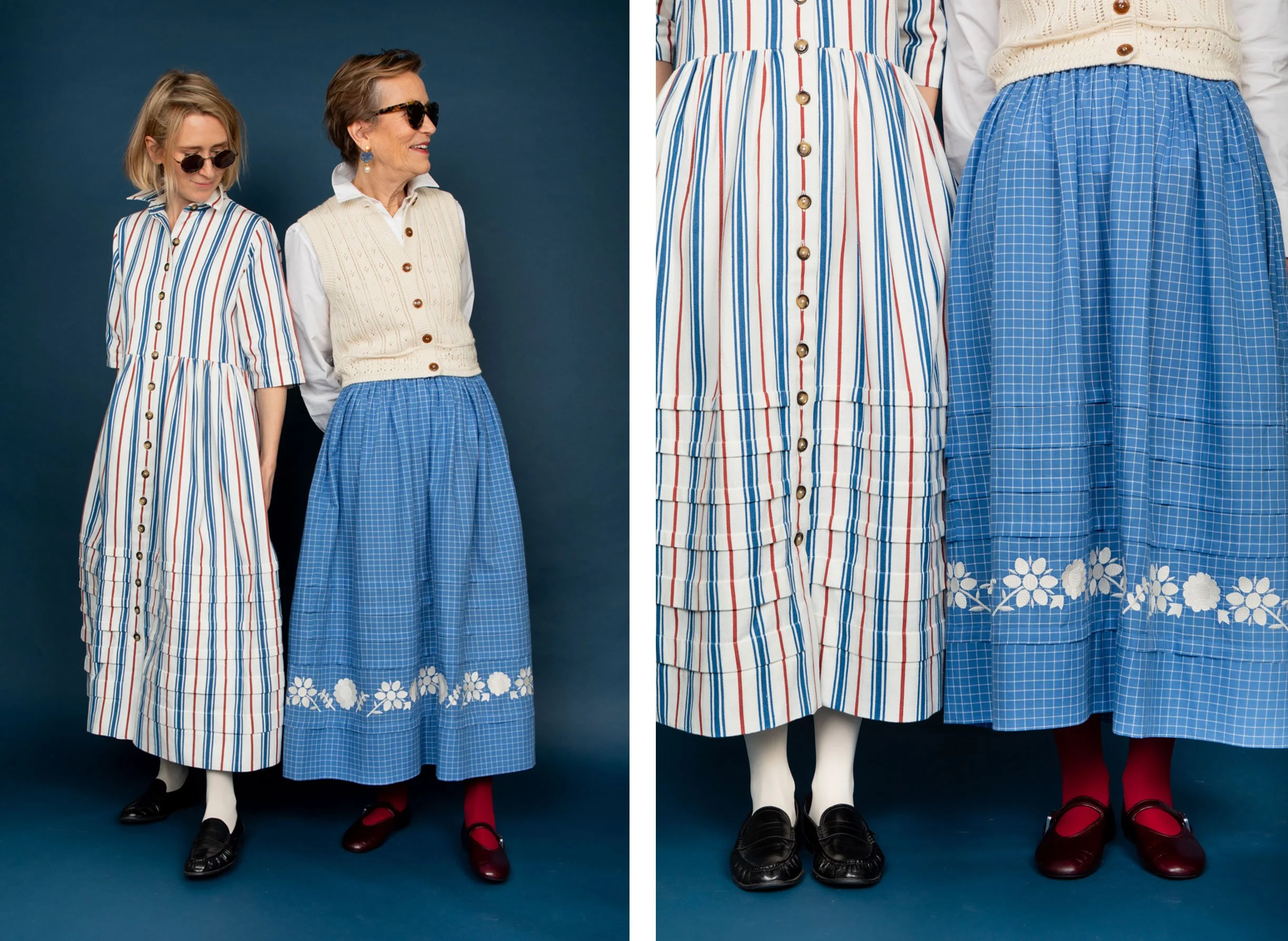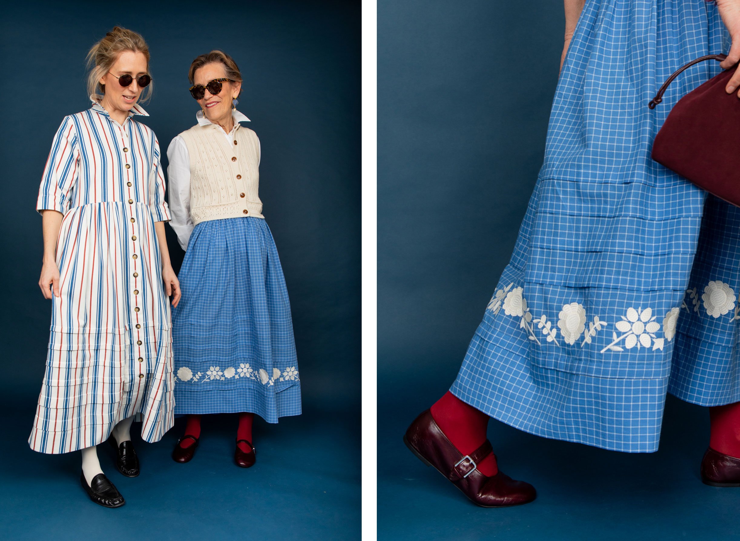 The quality of the clothes is excellent. They’re full of details that you might not find in other brands at a similar price point. For example, the layers of pleats at the bottom of both this dress and skirt are so striking, as is the embroidery on the skirt which is referenced from antique samples and documents. The weight of the stripy cotton twill is beautiful, heavy enough to hold its shape but not too heavy as to be bulky. Mum’s skirt has a draw string waist which enables it to be worn at any height. The pleats created through drawing the fabric are soft and pretty without being unflattering. Where the dresses have buttons down the front, they run from collar to hem which is luxurious and super chic.