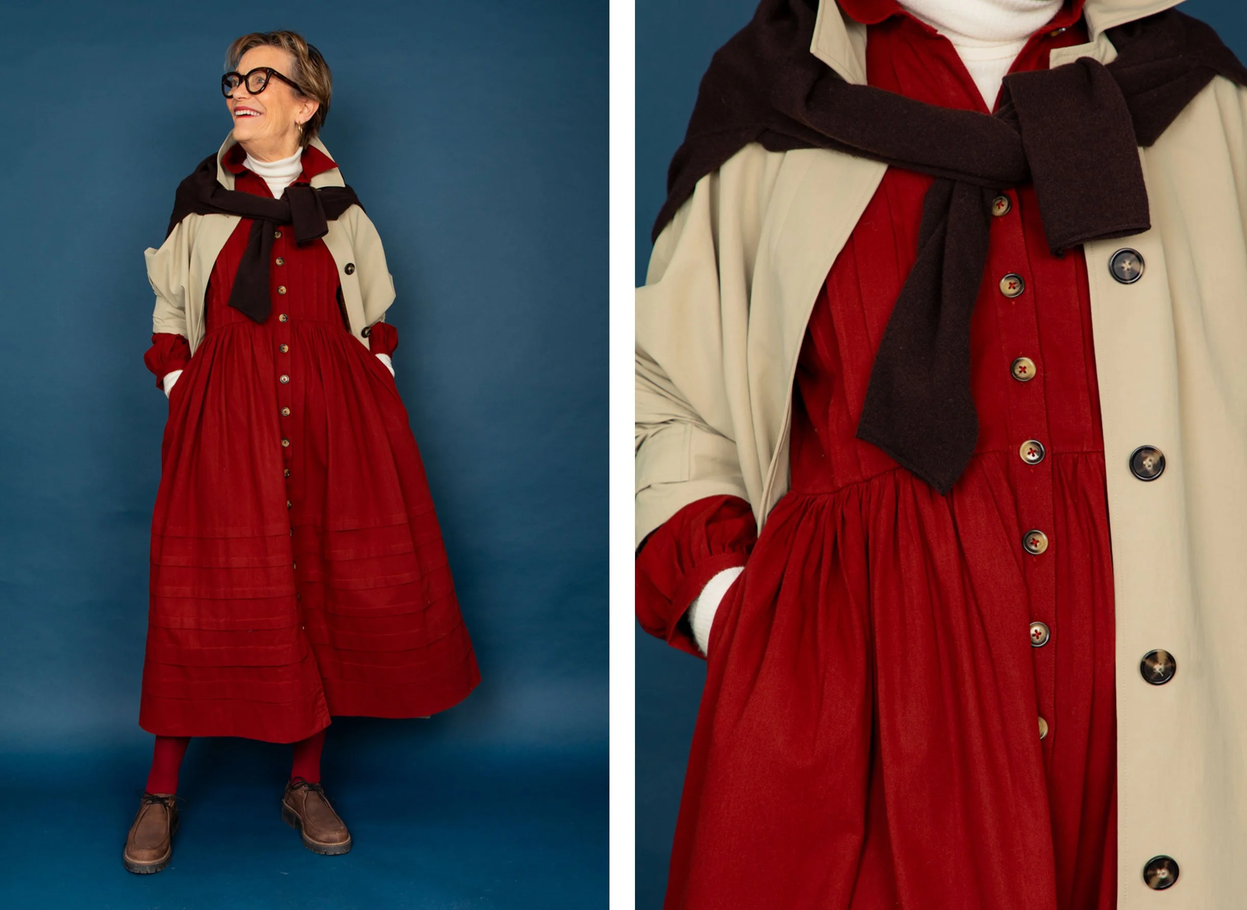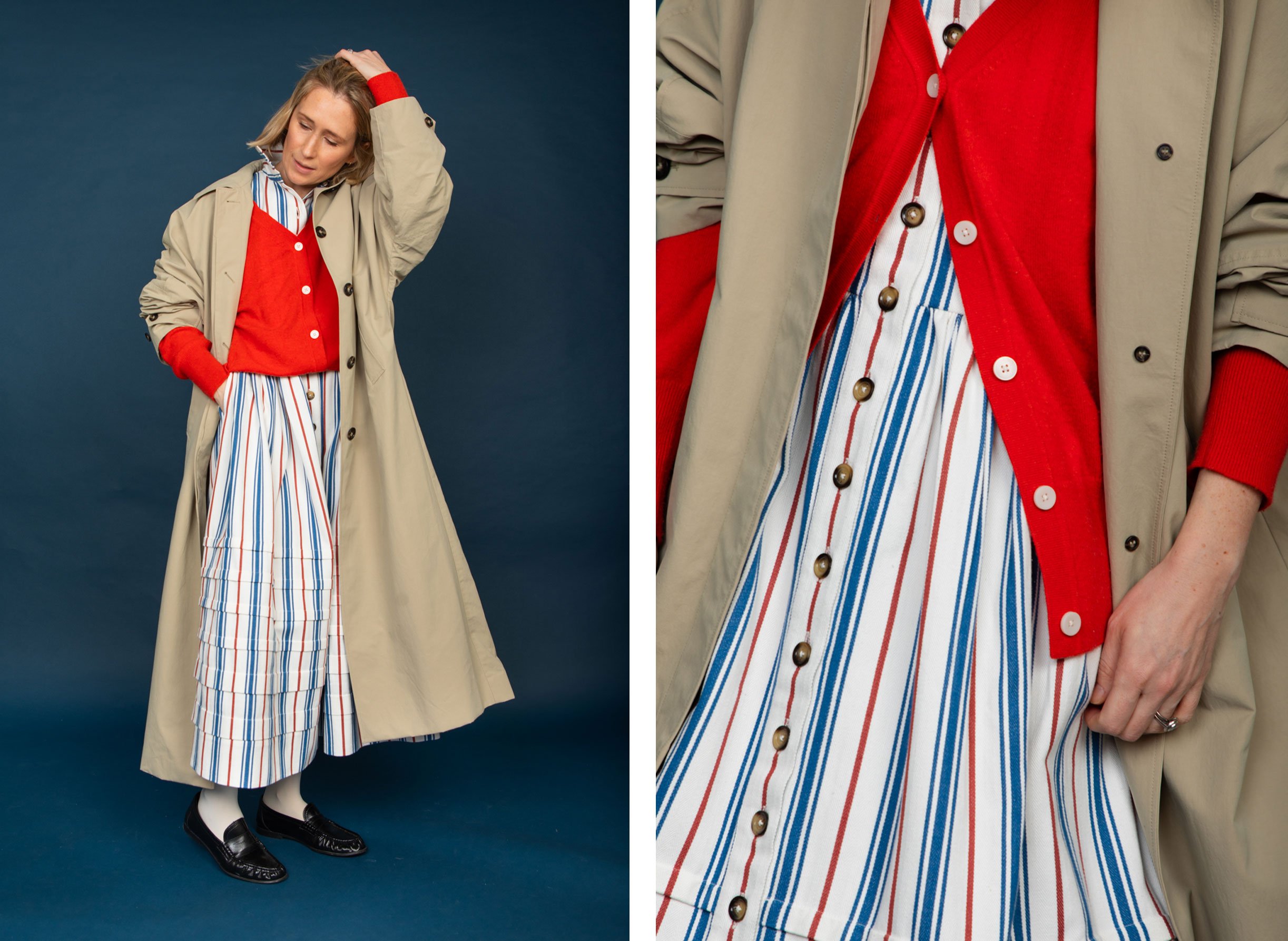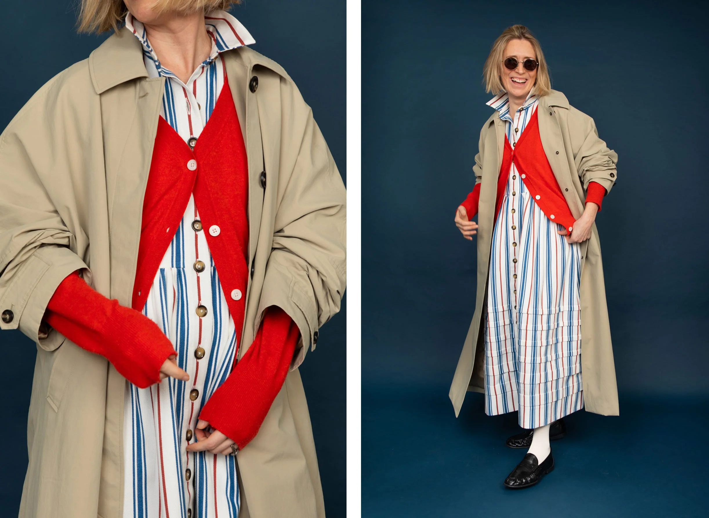In terms of knitwear and general layers (mainly for warmth as well as aesthetics!) we have gone for cardigans here. A bright red one which is longer and picks up the red of the stripe in the fabric and a lovely neat, sleeveless one. Of course, a fine knit polo neck would also work extremely well, as mum is wearing above with the red dress. This is such a clever way of extending the seasonal life of a dress. Uniqlo, Arket and COS all produce good ones, particularly the last two brands whose turtle-neck knits are extremely fine and come in the prettiest of colours.