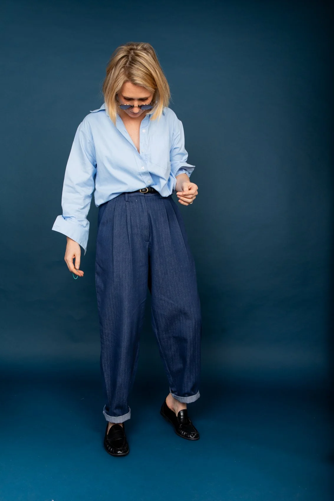 The denim peplum top above and the pleat-front trousers below are in fact a denim twill which took Gabby and her team a year of experimenting to achieve a fabric that had the look and work-hard ability of denim, but with a warm, softer feeling. The top, with its peplum hem, sits beautifully over high waisted trousers, making it a perfect throw-on and go top for the evening without any great effort! Although I haven’t shown it here, it looks great with the pleat-front trousers too for a more striking look - similar to a jumpsuit.