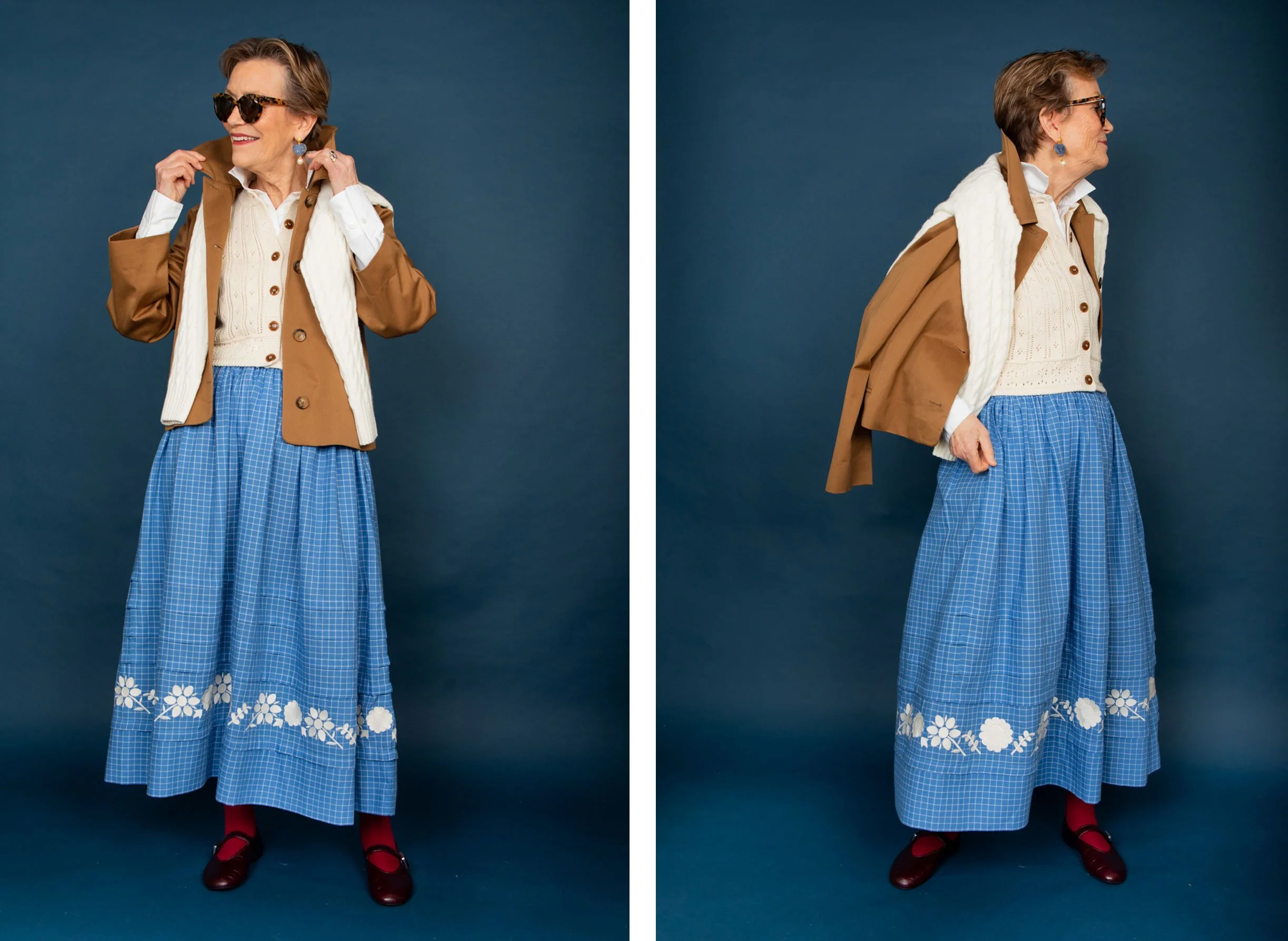 When choosing a coat to go over your dress or skirt, as a general rule I suggest that the hem of a long coat should meet the hem of the skirt and a short coat should sit at your waistline. Ideally, what you don’t want is for the hem of your coat to sit somewhere between the waist and hem.