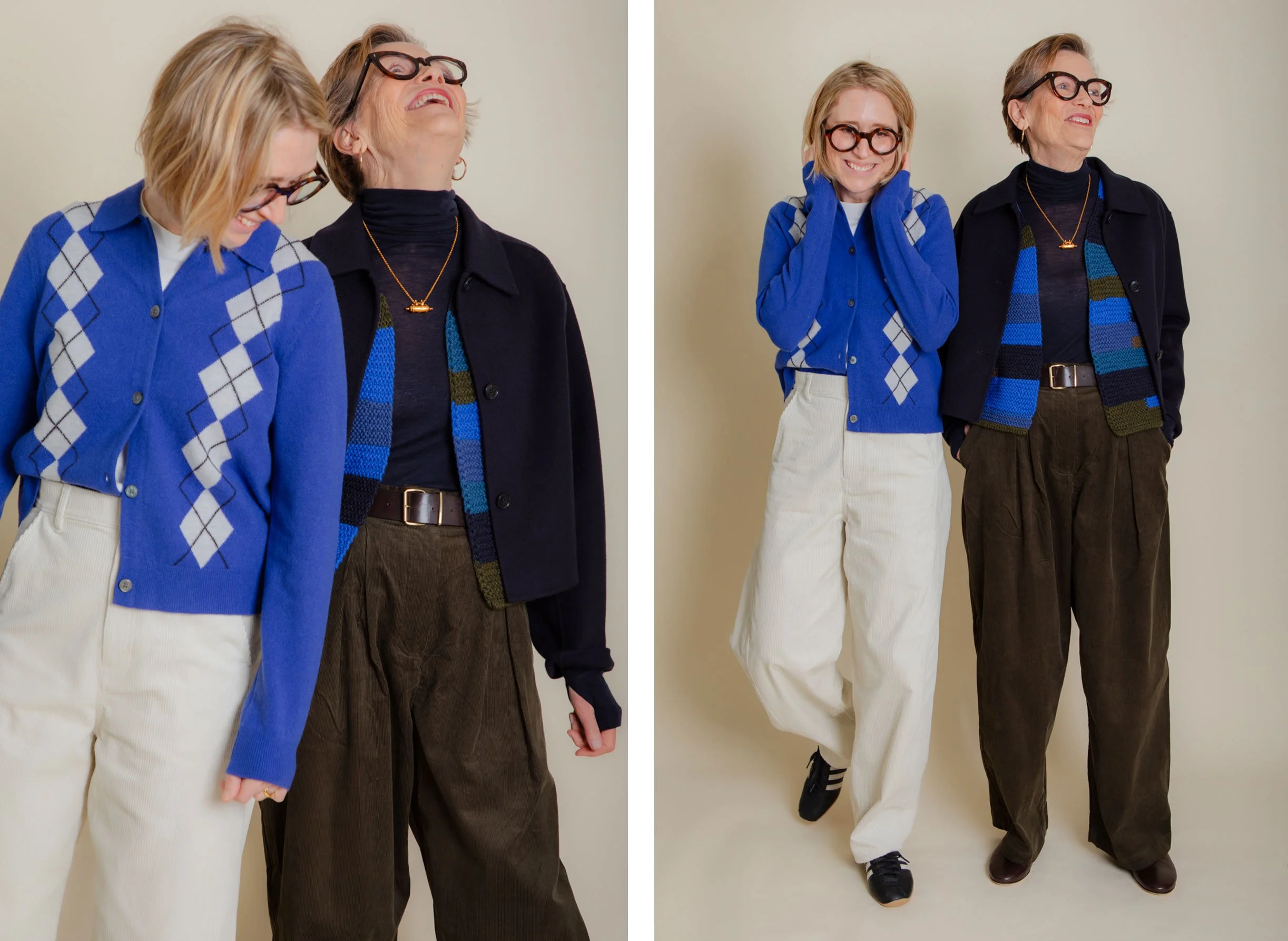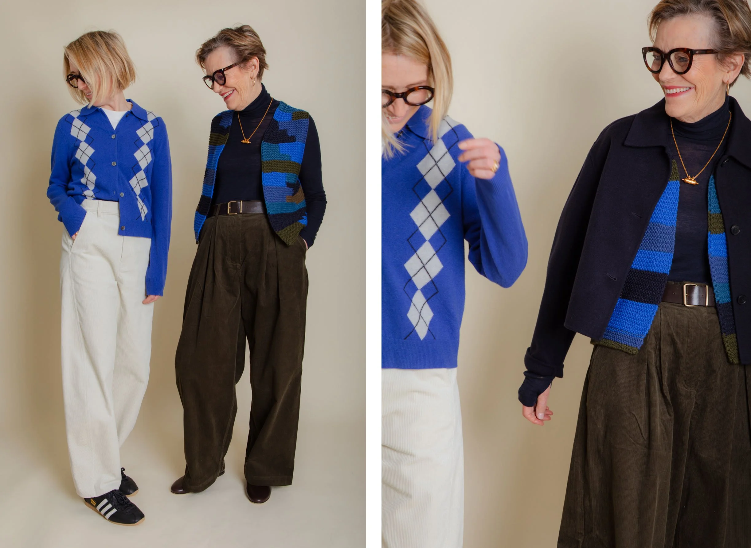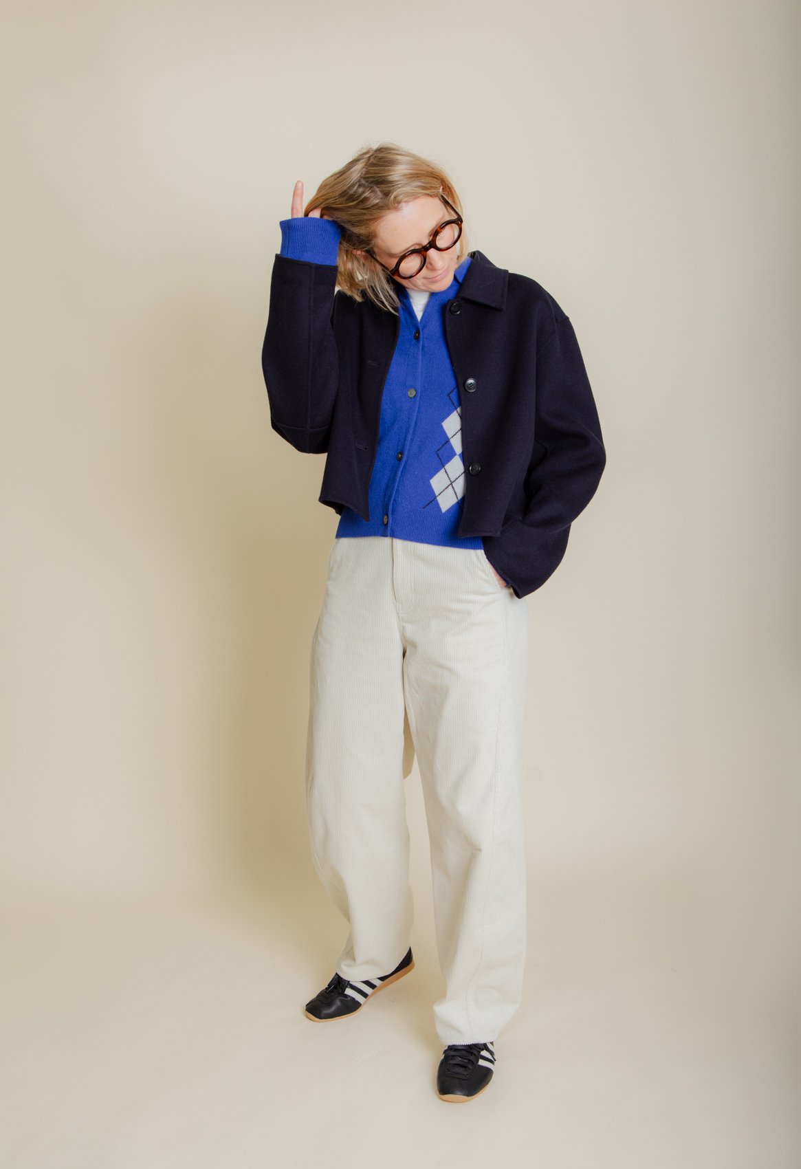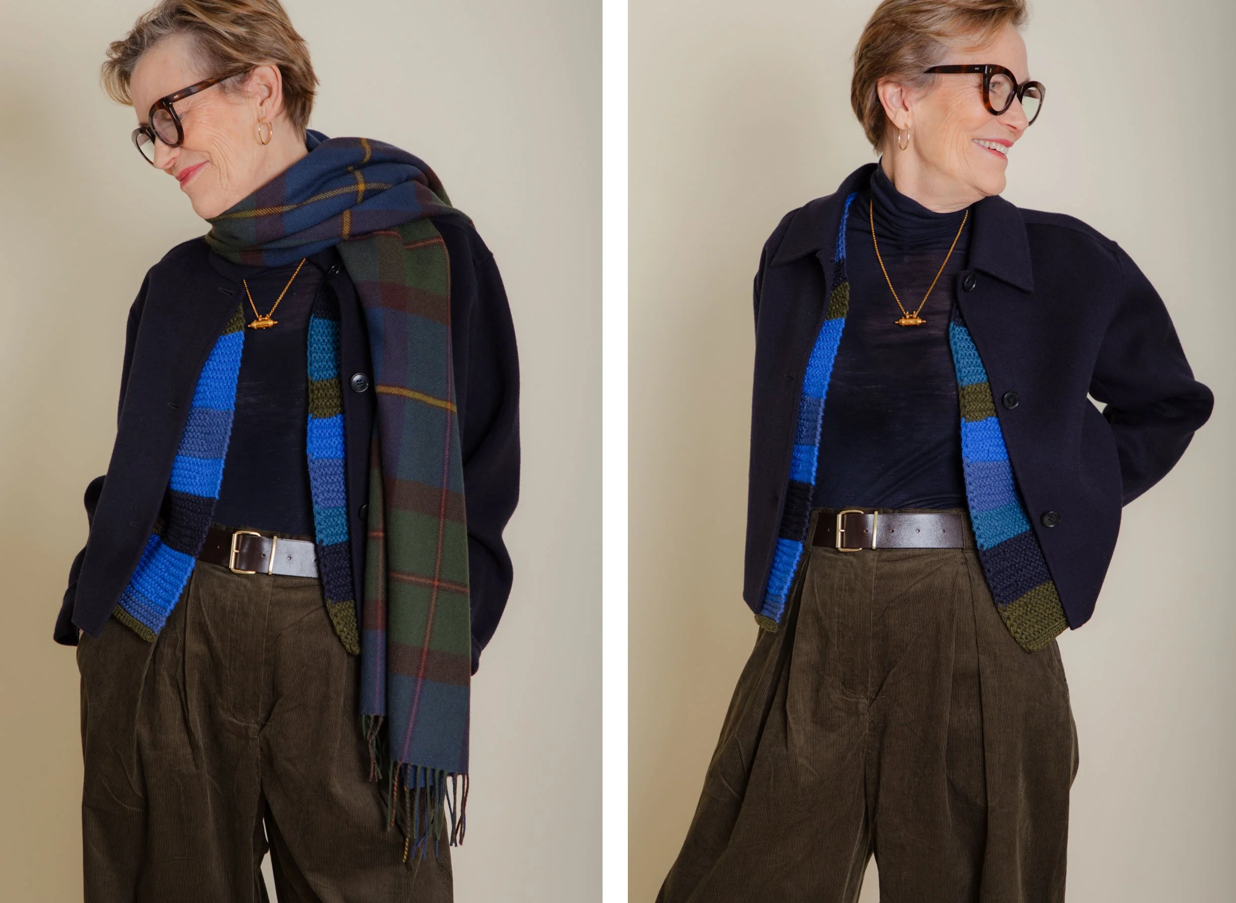 I really like this slightly cropped navy blue jacket too. As you can see from the pictures, it works well with both of our outfits. A versatile little jacket is such a useful piece to have in your wardrobe. A piece that elevates an otherwise simple look into something more ‘put together’. I particularly love a double faced wool fabric. It offers warmth without bulk and wears extremely well. Unlike other wool fabrics it doesn’t seem to bobble at all, meaning that the garment remains looking as new and smart as the day it was bought.