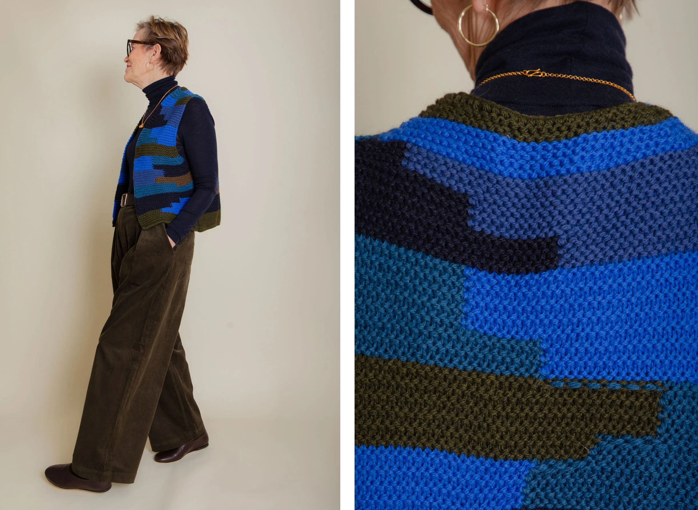 Blue skies ahead, hopefully! So with that in mind, we are wearing our favourite colour this week - blue! I saw the knitted waistcoat at the TOAST press day (an event held to showcase their next season’s collection to press) a while ago and earmarked it then. The colours are wonderful! In a climate where it can often feel difficult to find unique pieces, this waistcoat felt just that, unique. Perfect for now under other layers to add interest and colour, or over a t-shirt as the weather warms up. It represents a trans-seasonal garment. Particularly useful if, like us, you wear a lot of blues, greens and earthy colours that the waistcoat would sit very happily with.