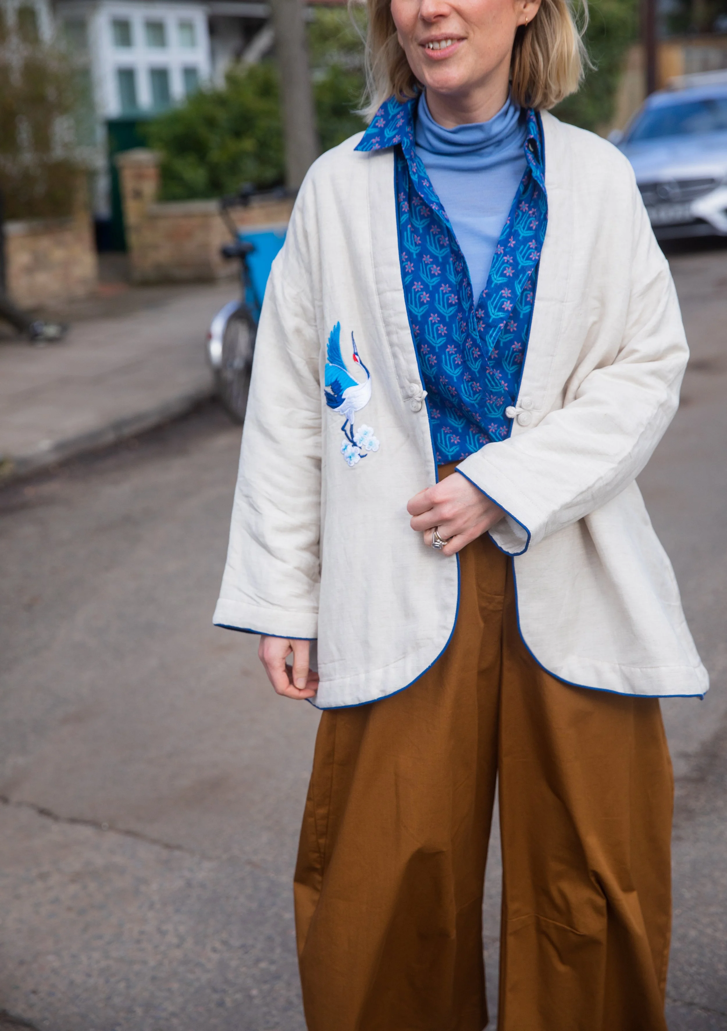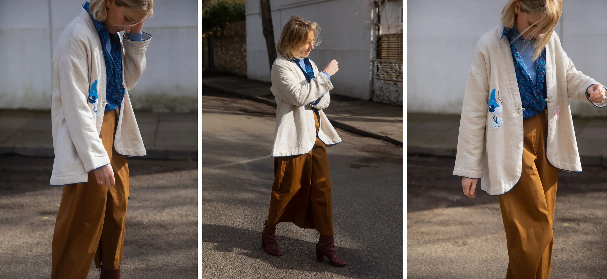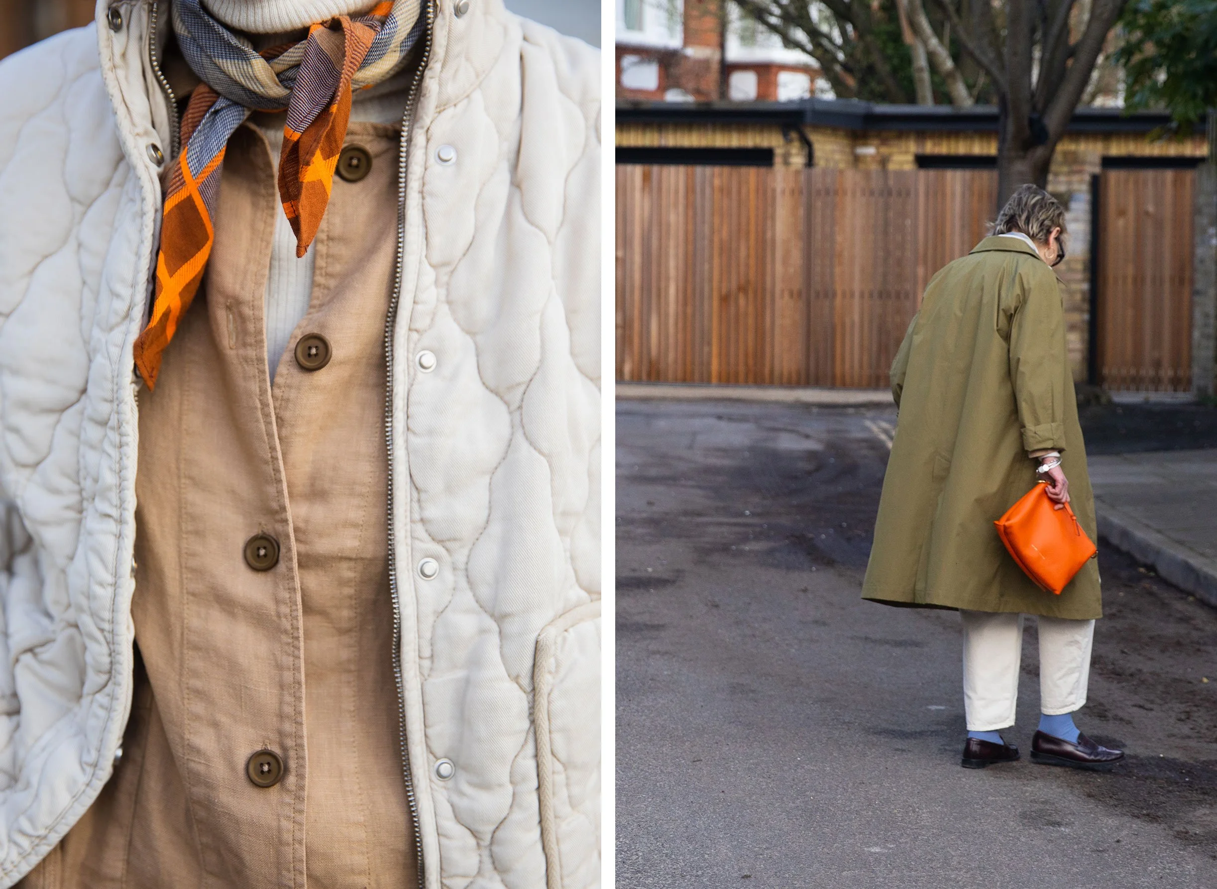 When putting an outfit of colour together, as a guideline I would pick two dominant colours - the blue and tobacco - then an accent of another colour (the cream jacket). This prevents the outfit from looking too ‘matchy-matchy’. As a rule you never want to have more than three distinct colours in an outfit. Mum’s look for example - I would consider her overall outfit to be ‘one’ colour (tones of cream and beige) and then we have added the blue socks and orange bag as ‘pops’ of colour. The ‘pops’ can be contrasting but they have to be complimentary. The necktie ‘anchors’ the orange and blue as it has both these colours in its pattern.