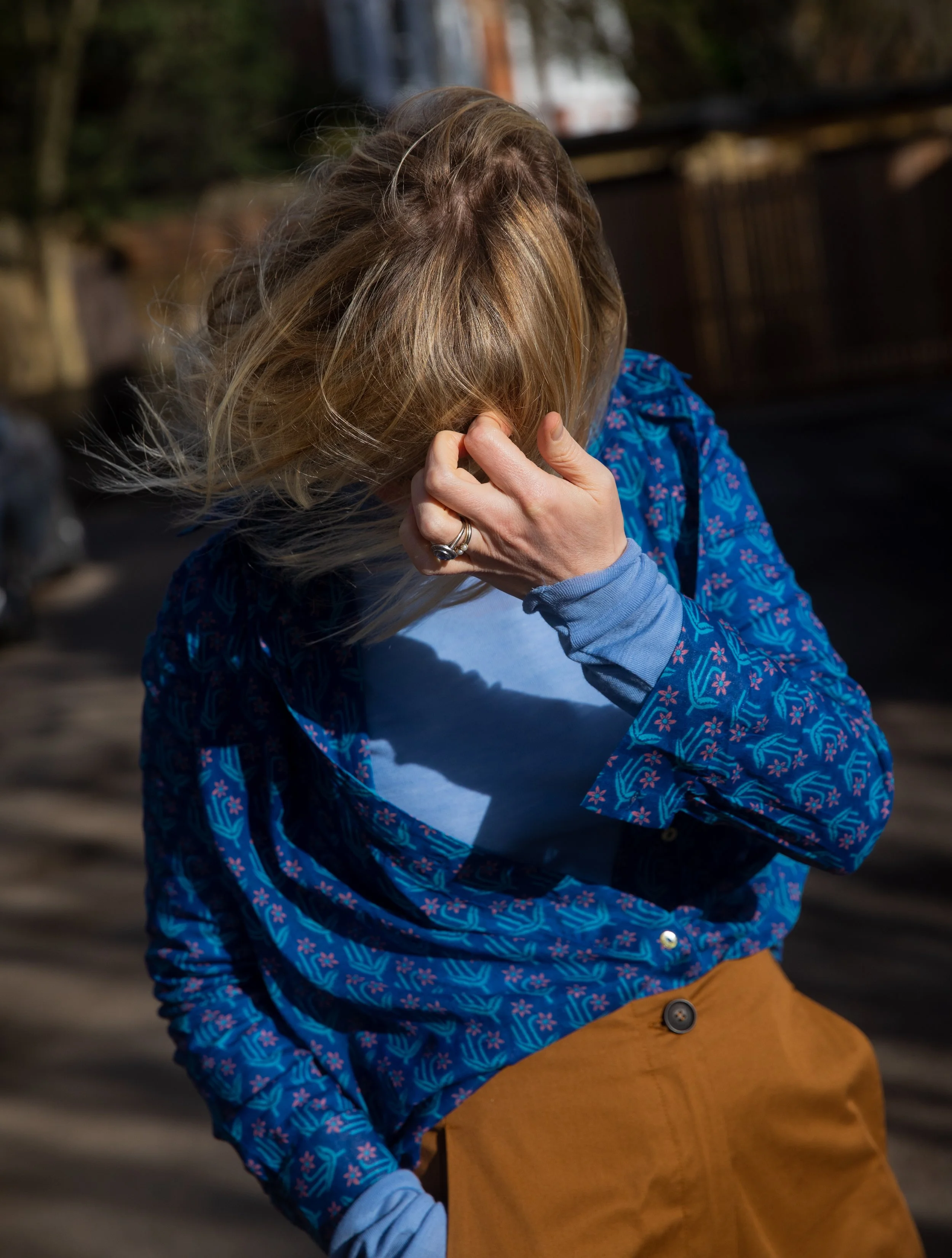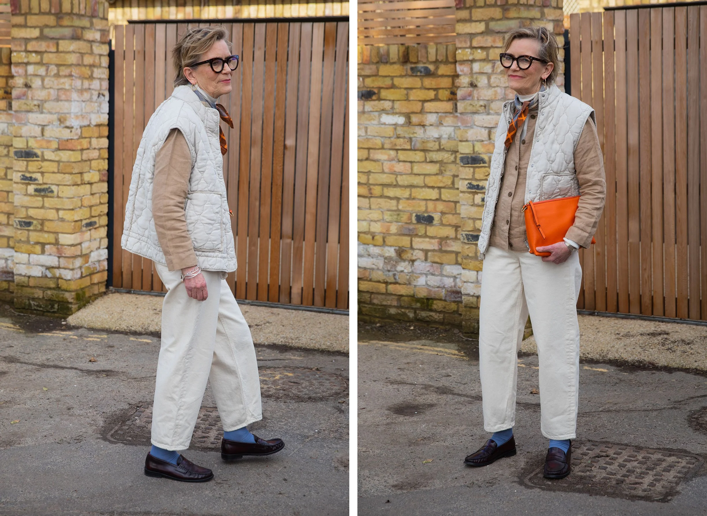 Mum is wearing the barrel leg jeans from COS. They have been producing this style for a while now and I have found it to be a flattering shape on most figures. The style has a very subtle curve from the hip and then tapers to the ankle creating a lovely silhouette. For a pear shaped figure they skim the natural contours of your body and draw the eye to your smallest parts- waist and ankles. If your figure is straight up and down then this cut creates shape. For an apple figure it also works well but what you might want to do is wear the jeans with a top (either a loose fitting t-shirt or a shirt) that sits on the hip bone, thus drawing the eye down over your widest part.
