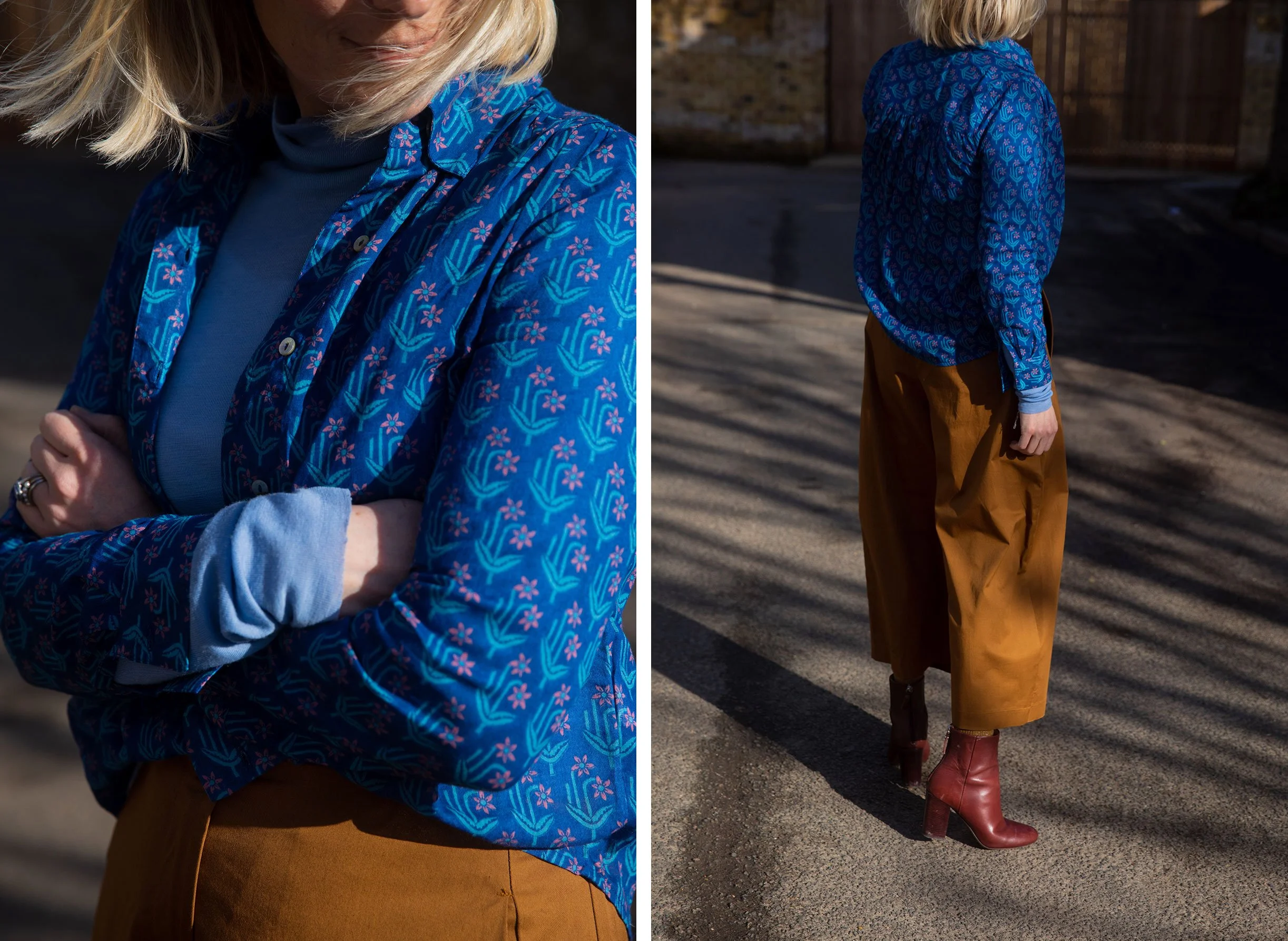 I have chosen a more unusual colour combination this week. Unusual colour combinations are a great way of elevating a high-street outfit into something more interesting. I am wearing one of my trusty Cos/Arket fine wool turtleneck tops, brilliant for elongating the life of more ‘summery’ pieces in you wardrobe. This shirt is made from a very lightweight cotton so the turtleneck works perfectly - obviously a second layer won’t be necessary soon!